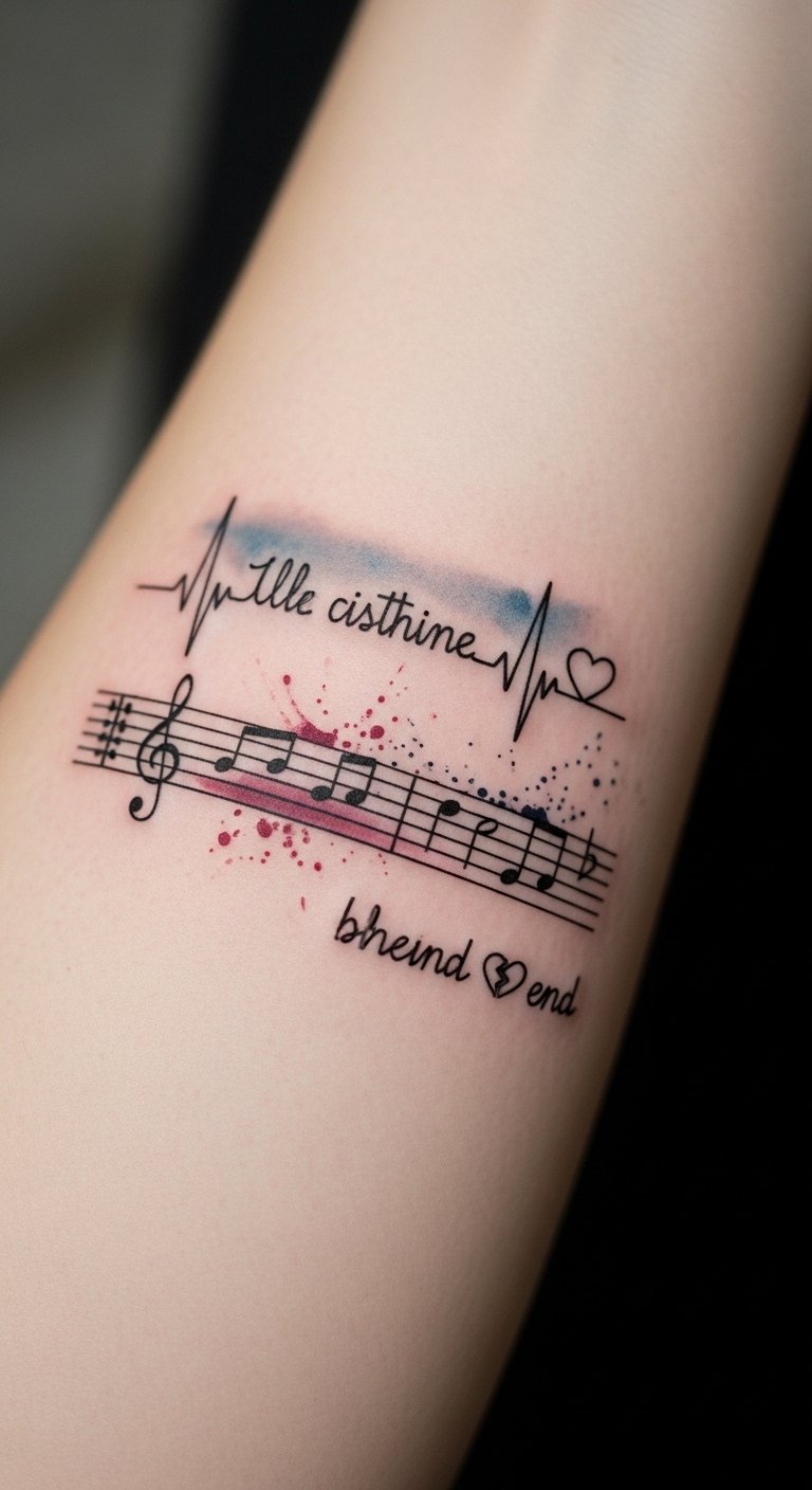 The design blends literal and symbolic elements: the heartbeat line ties the lyrics to life and rhythm, the musical staff and notes make the source explicit, and the ink-splatter watercolor hints at raw emotion and permanence.