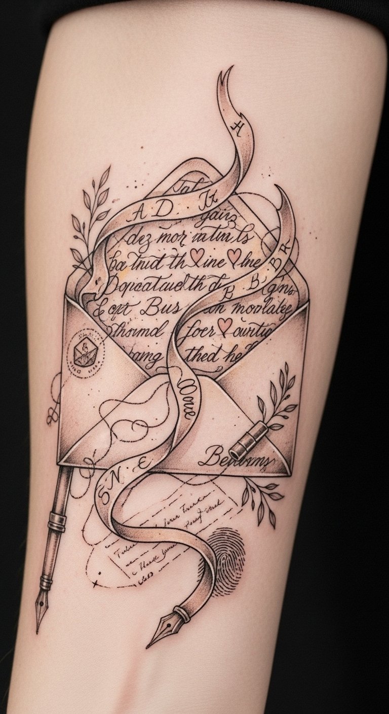 In this design, the envelope and flowing handwritten ribbons literally carry the original words, turning each curve of the pen into visible strands that wrap around the forearm or along the ribcage, symbolizing how family memories physically and emotionally surround and support you.
