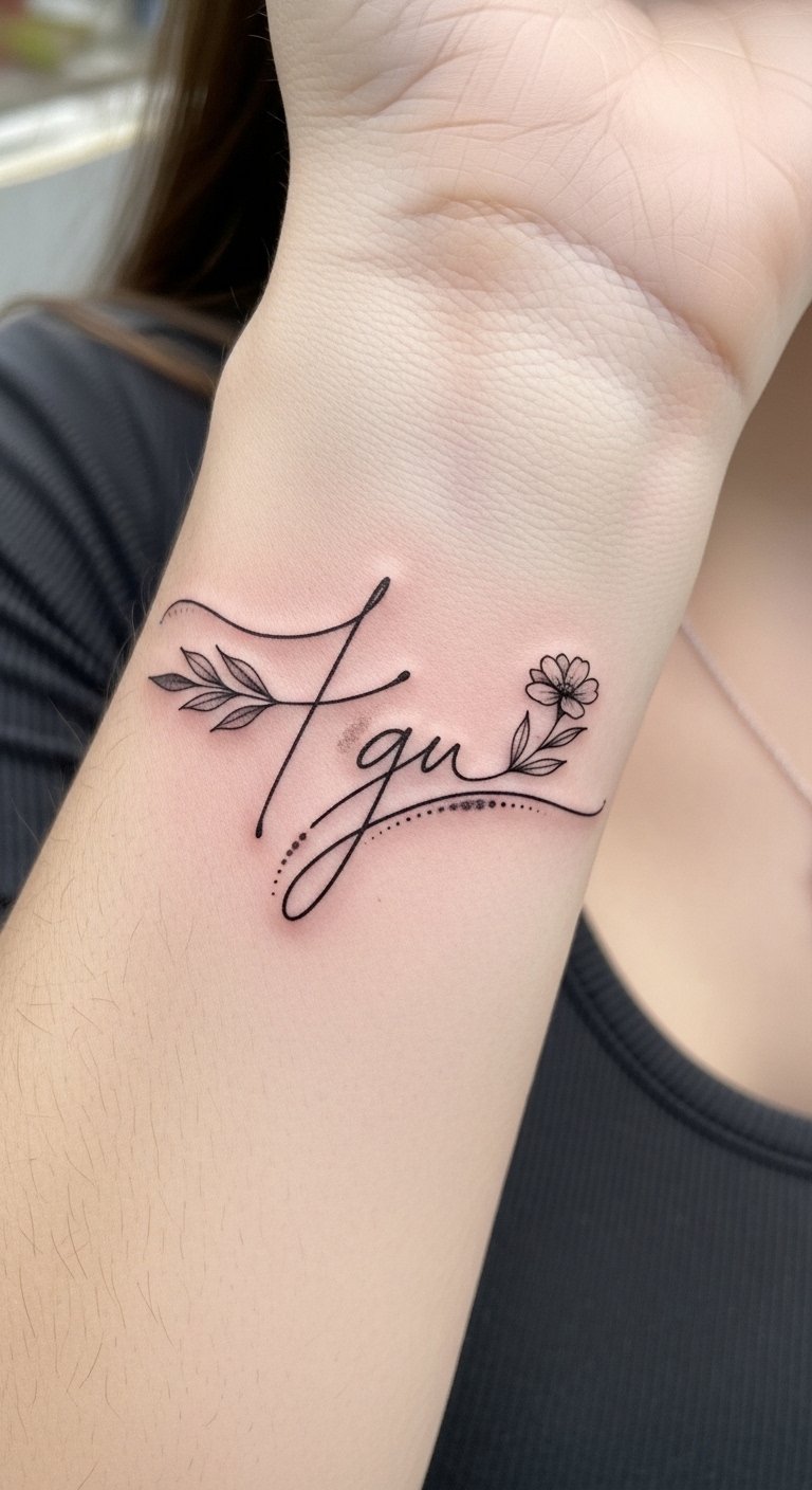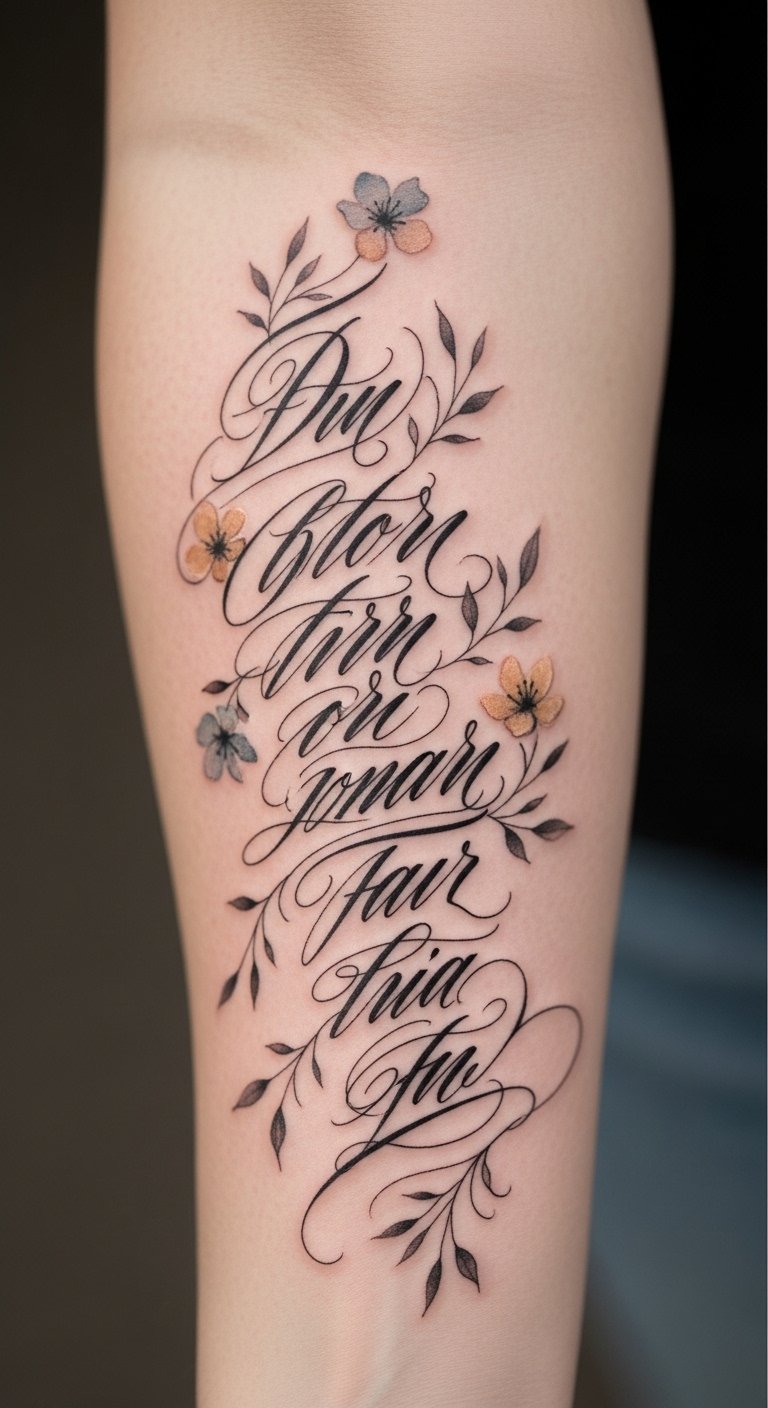 Its flowing script follows natural body contours—ideal for the inner forearm, ribcage, or collarbone—so the words read as a private mantra when glanced at, while the botanical vignette anchors the composition and softens the piece emotionally.