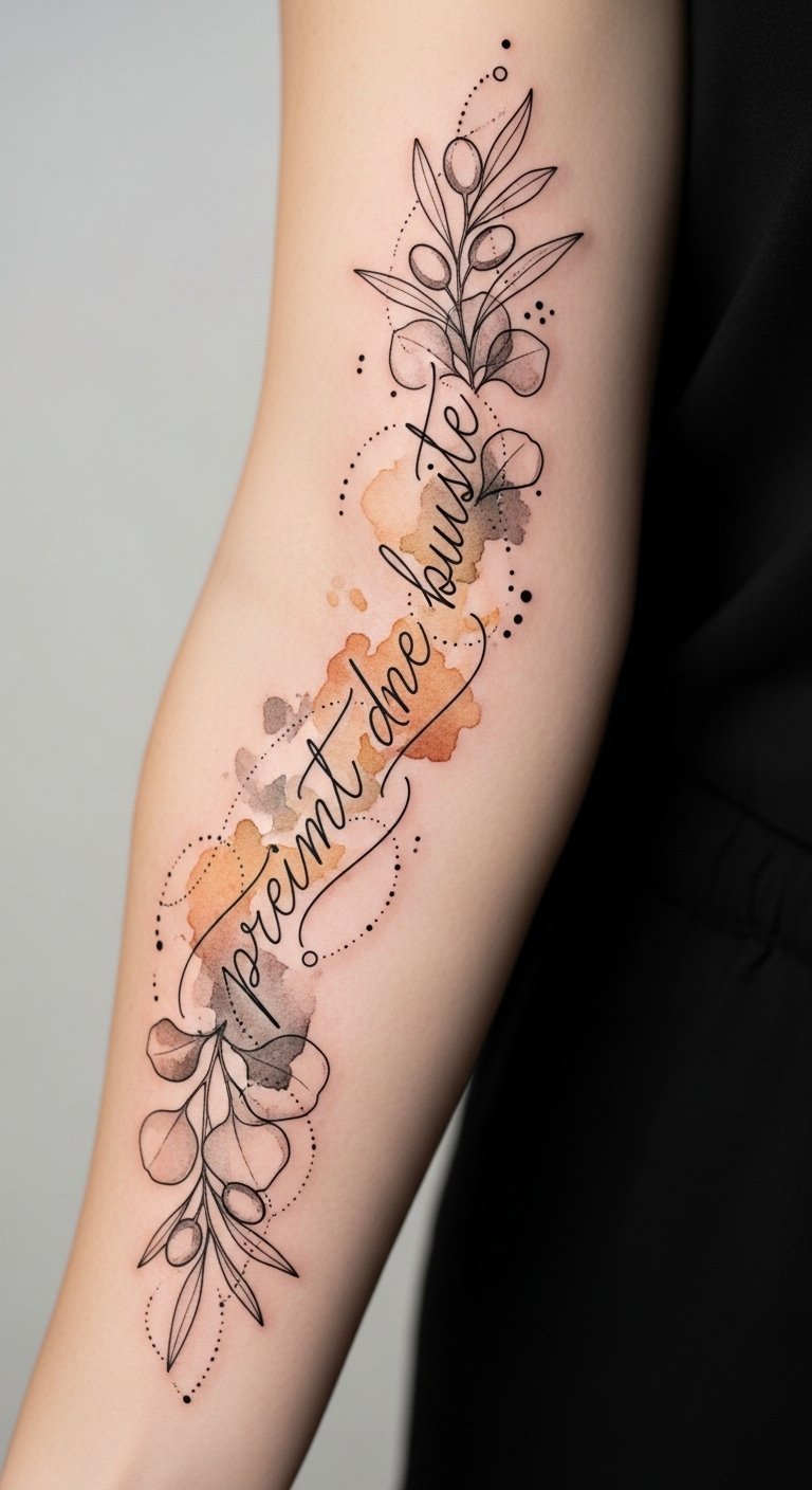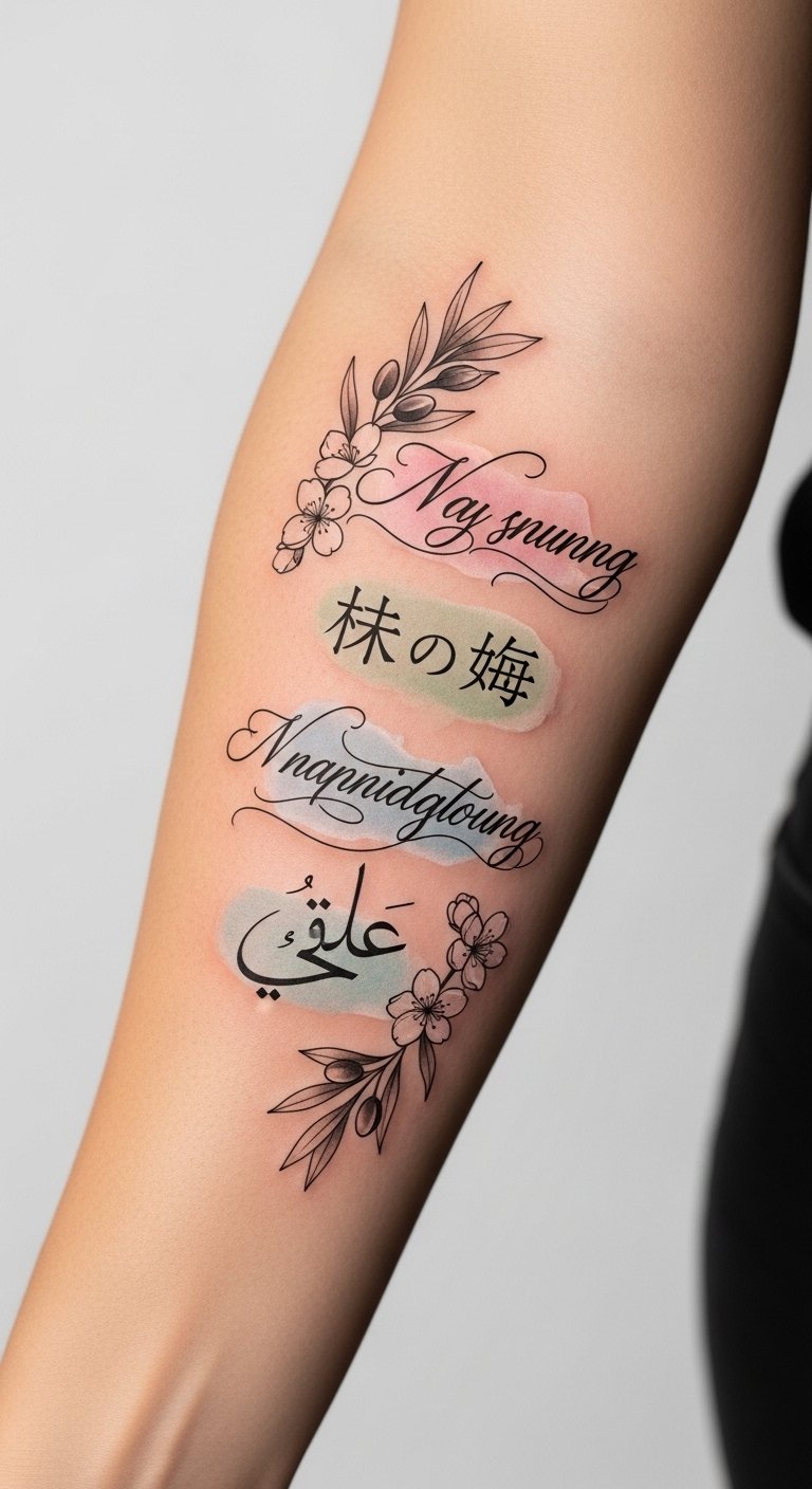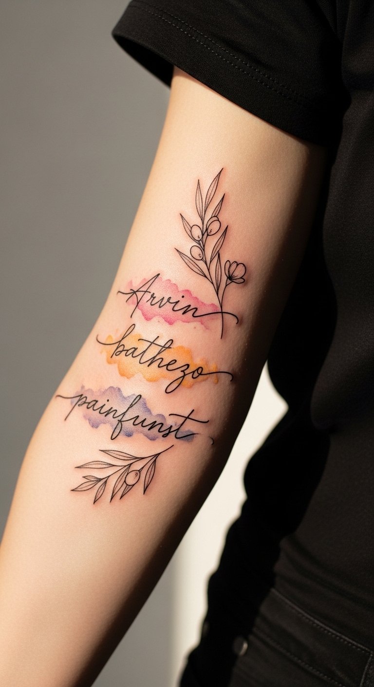This design symbolizes unity through language, the watercolor hues representing the emotions tied to each phrase while the botanical elements evoke growth and remembrance; placement on the inner forearm or ribcage keeps it intimate and personal, behind the ear offers a quieter, discreet reminder.