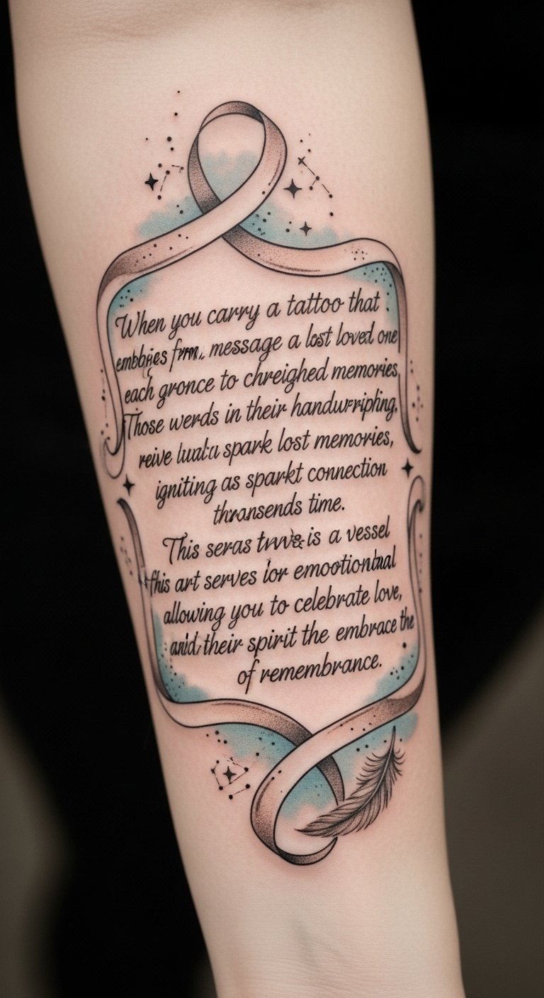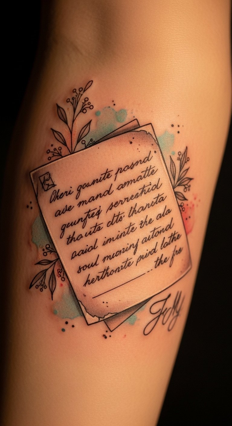 This design concept uses the exact text as the tattoo itself, emphasizing intimacy and authenticity: the flowing script communicates tenderness and continuity, the watercolor blushes highlight emotionally significant phrases without overpowering the handwriting, and the inclusion of a real-looking signature anchors the piece as a personal relic. Emotionally, the tattoo embodies remembrance, identity, and permanence—ideal for someone honoring a relationship, milestone, or guiding words. Recommended placements (inner forearm, ribcage, clavicle) offer varying degrees of visibility and privacy: forearm for daily affirmation, ribcage for close-held memory, clavicle for subtle elegance.