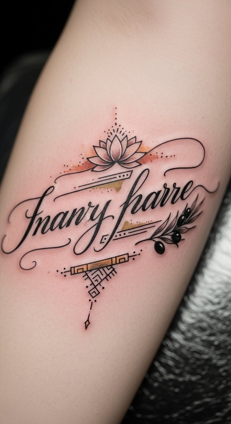 Choose a phrase that resonates deeply, and let it be your personal mantra, beautifully inked. The design emphasizes connection and continuity: flowing calligraphy evokes movement and personal journey, watercolor accents add warmth and depth, and small cultural motifs anchor the phrase to heritage.