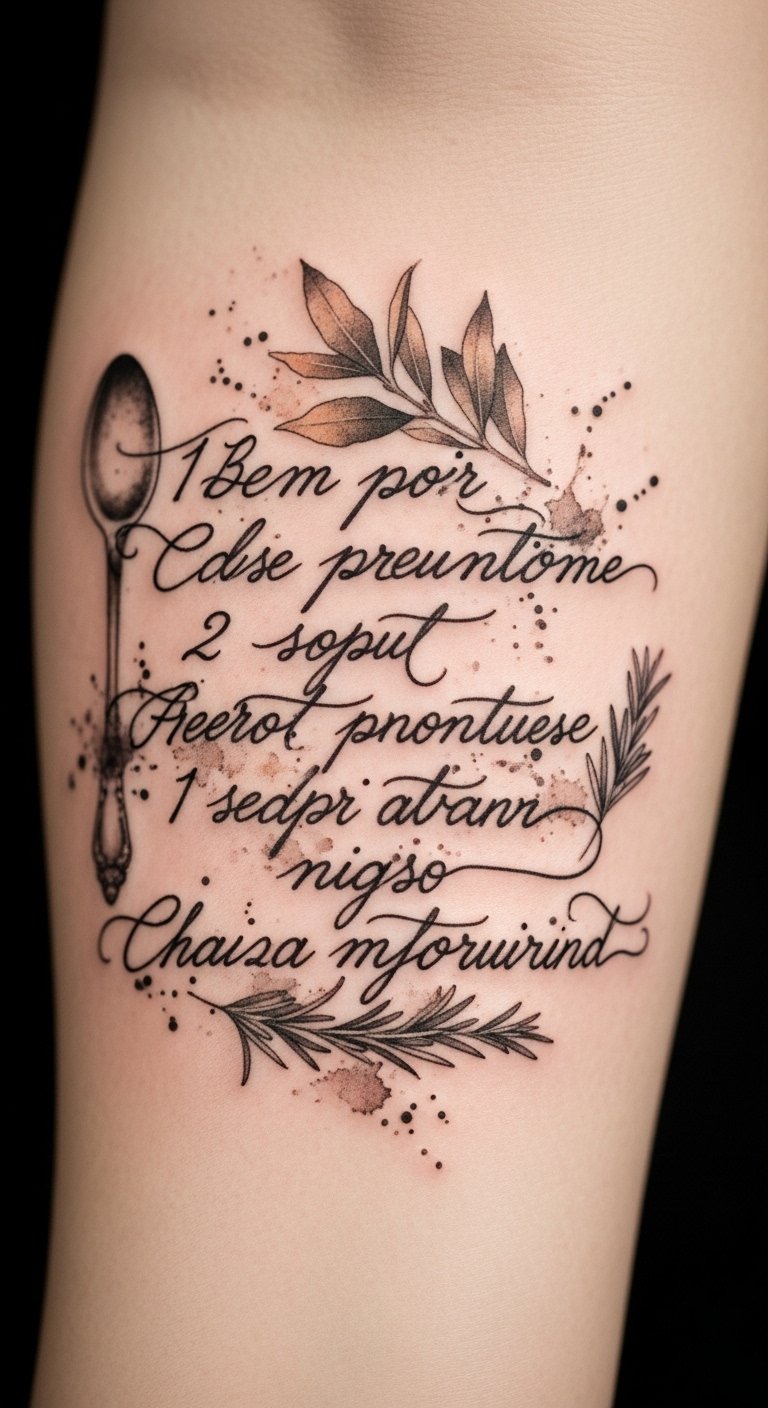 Imagine capturing those beloved handwritten recipes or ingredient lists in ink on your skin, celebrating family traditions and personal journeys, forever preserving the essence of your culinary experiences. The design symbolizes continuity, memory, and nourishment—each botanical sprig representing growth and roots, the spoon hinting at the act of sharing, and the sepia wash evoking aged paper and heirloom pages.