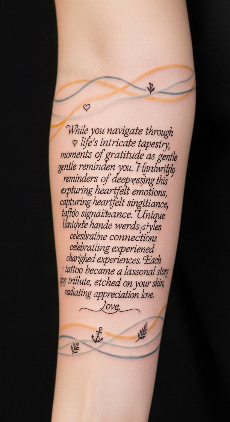 Each tattoo becomes a lasting tribute, a personal story etched on your skin, radiating appreciation and love. The design combines intimate, flowing script with whisper-thin watercolor threads to evoke woven memories and emotional warmth; the tiny symbols personalize meaning (heart for love, anchor for grounding, leaf for growth).