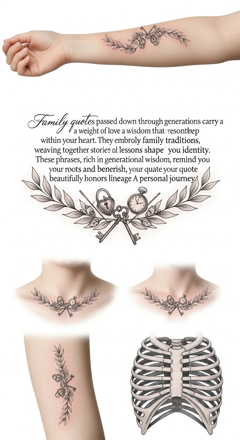 The laurel wreath represents honor and continuity while the vintage keys and heirloom symbols signify unlocking family history and preserved traditions; the fine-line script keeps the personal quote intimate and readable, evoking warmth and reverence.