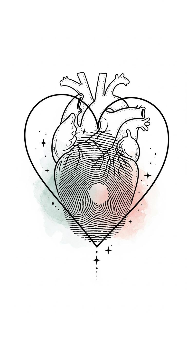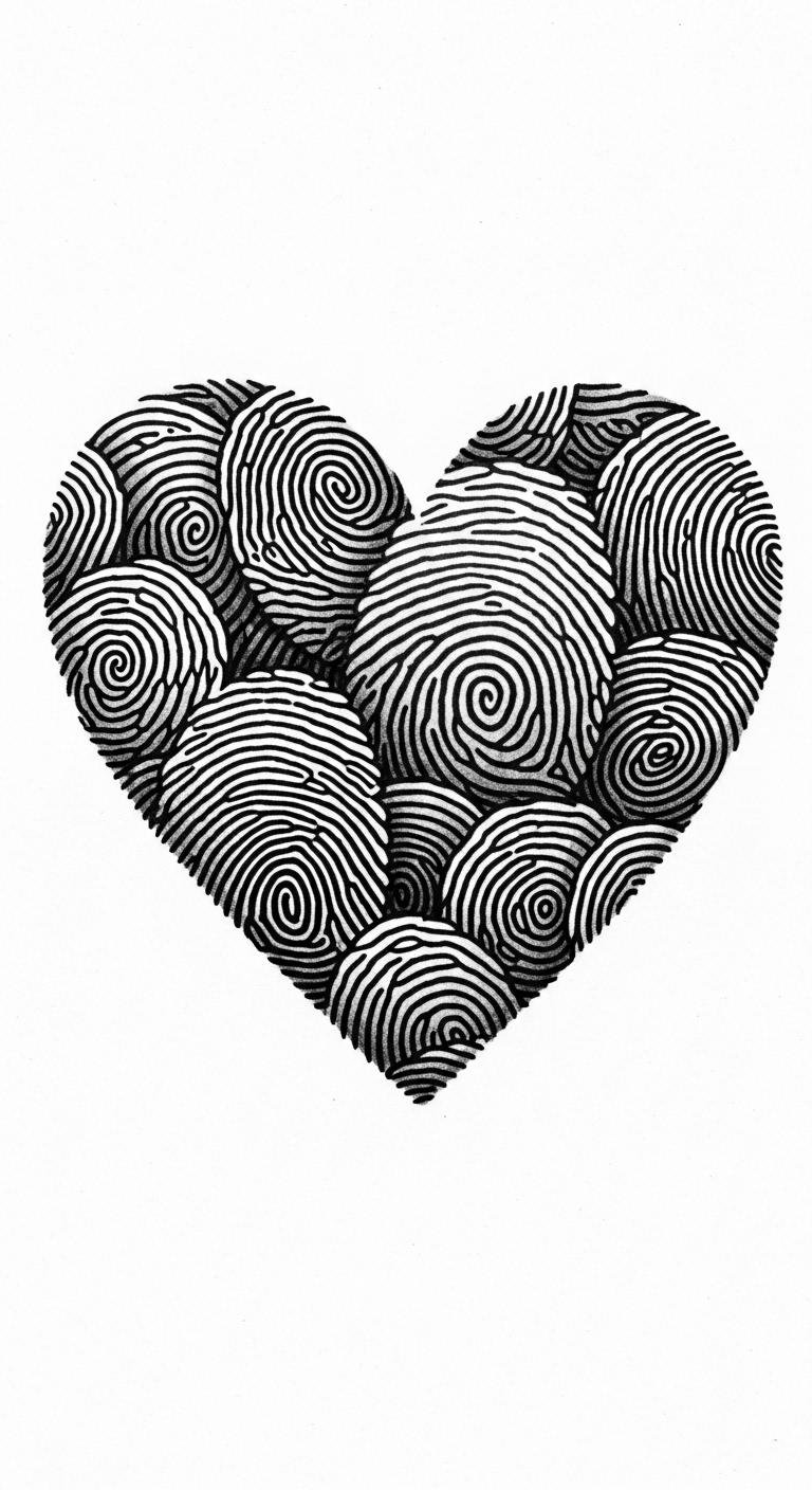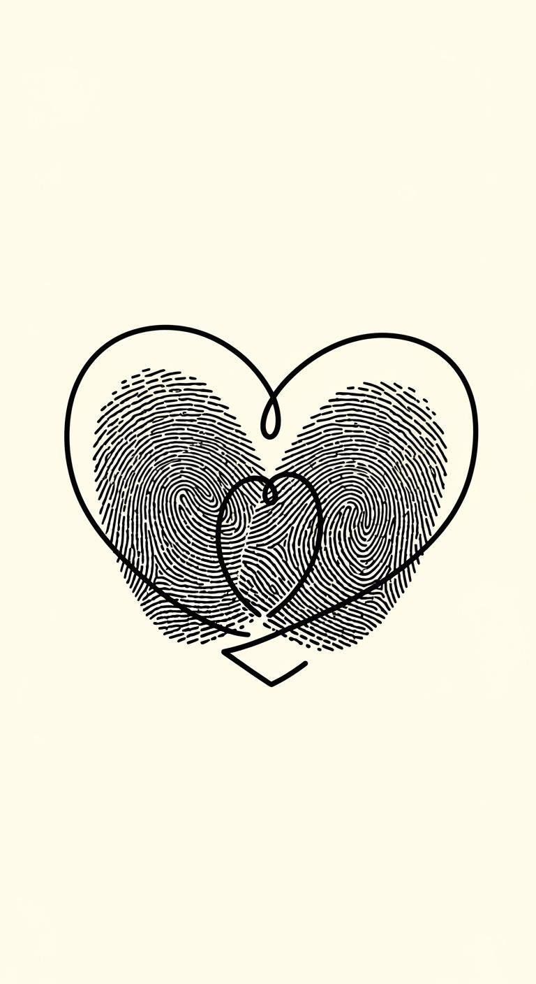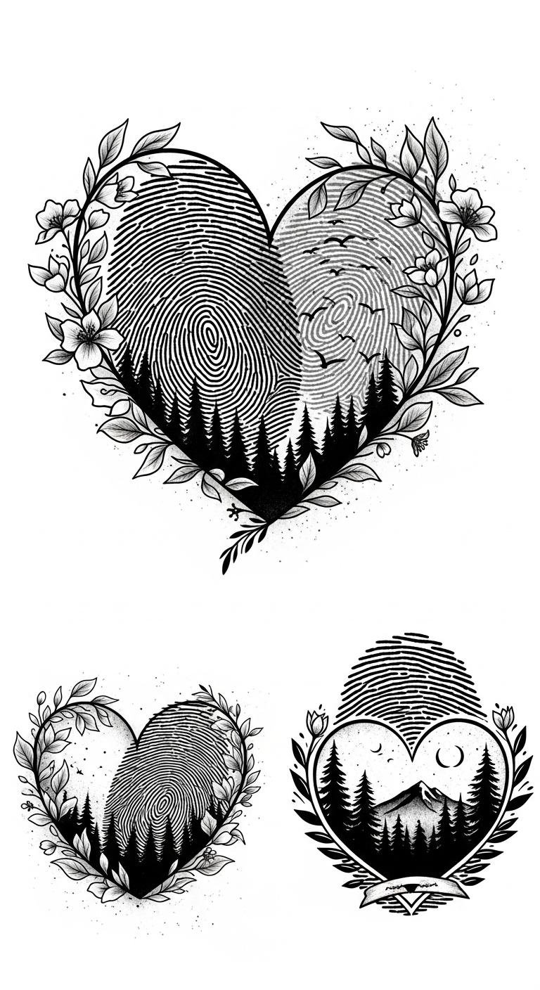 This concept pairs the intimate language of fingerprints with a stylized heart silhouette to symbolize personal love and identity; fine-line ridges flow into heart contours, with subtle negative-space highlights and soft gradients for depth.