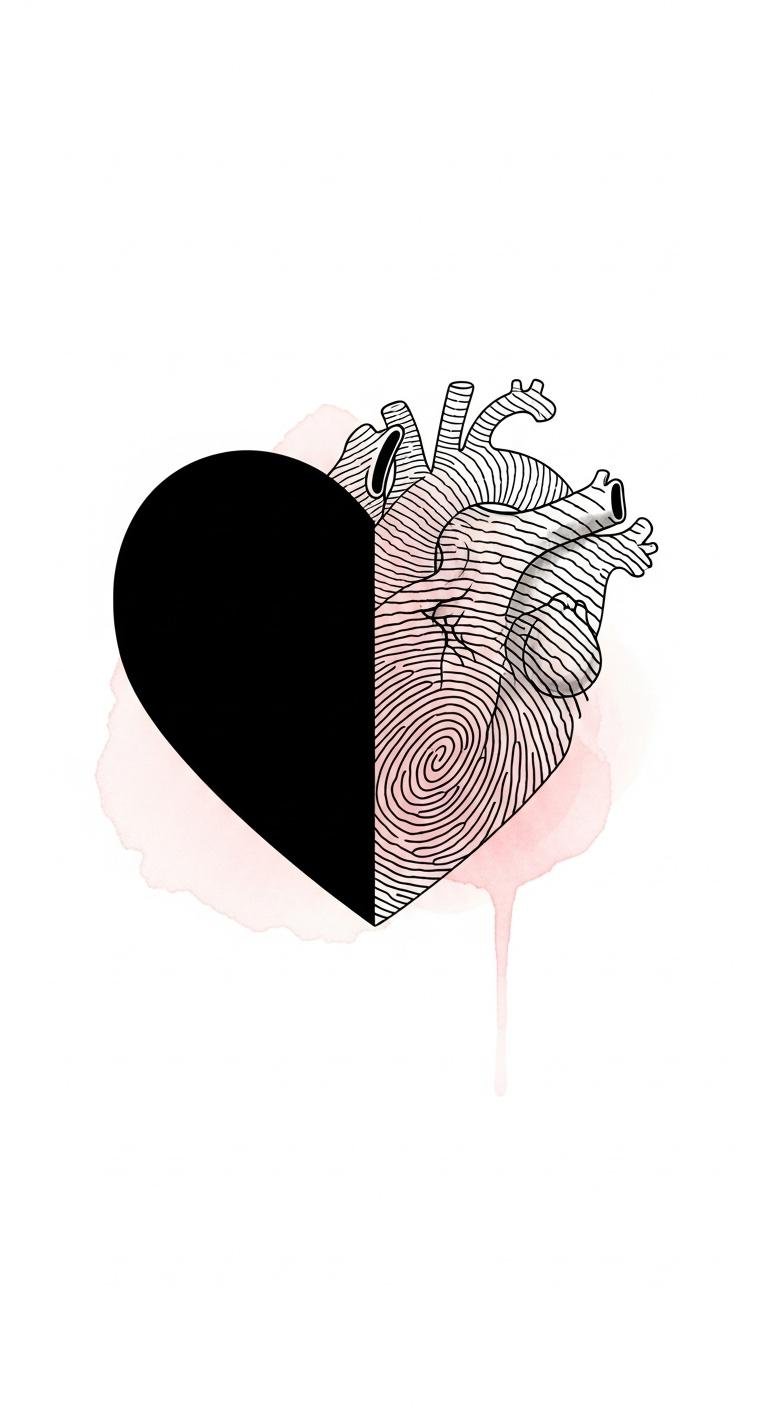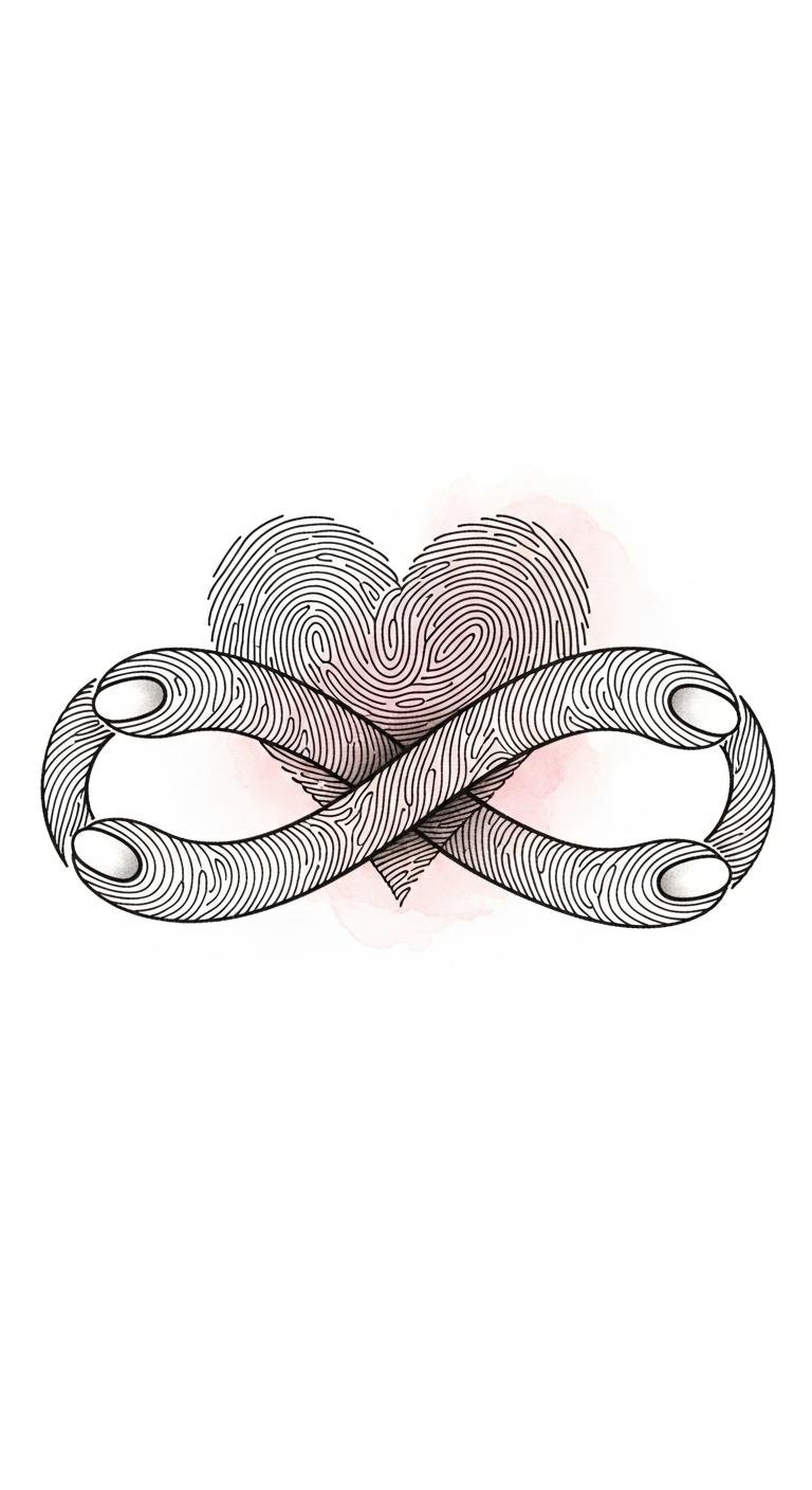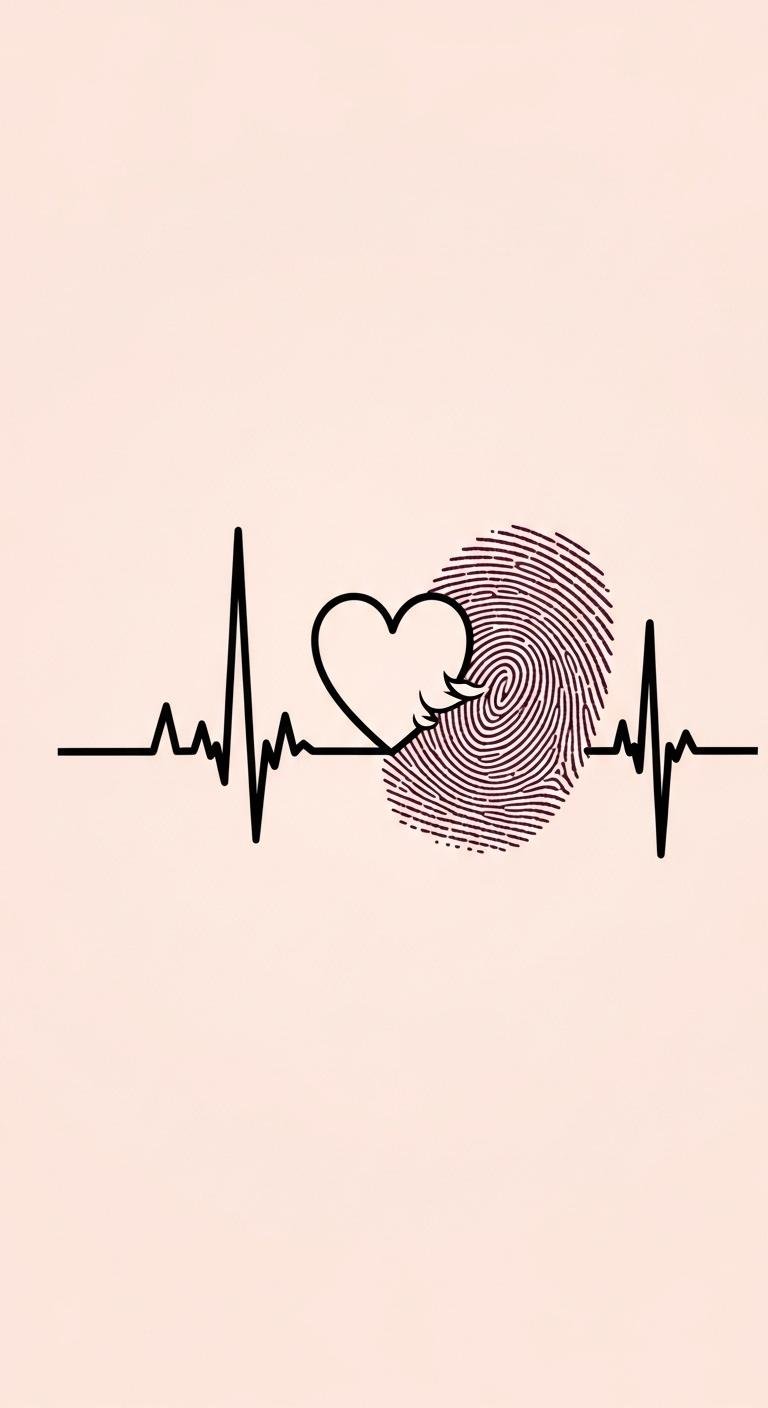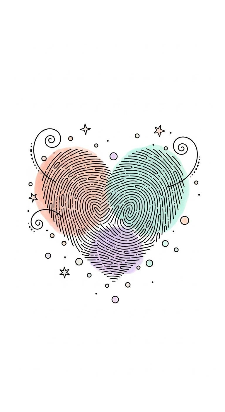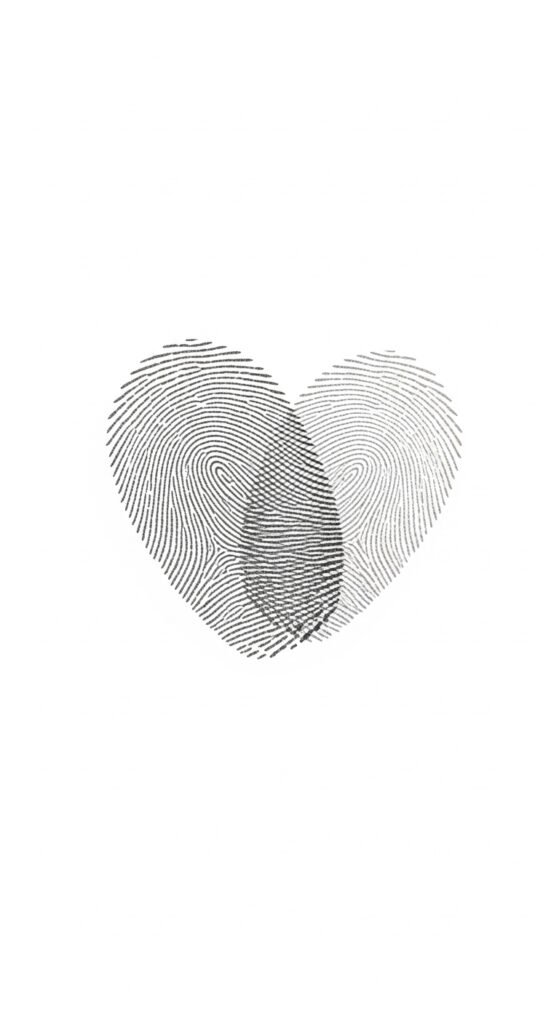 This concept pairs the intimate language of fingerprints with a stylized heart silhouette to symbolize personal love and identity; fine-line ridges flow into heart contours, with subtle negative-space highlights and soft gradients for depth.