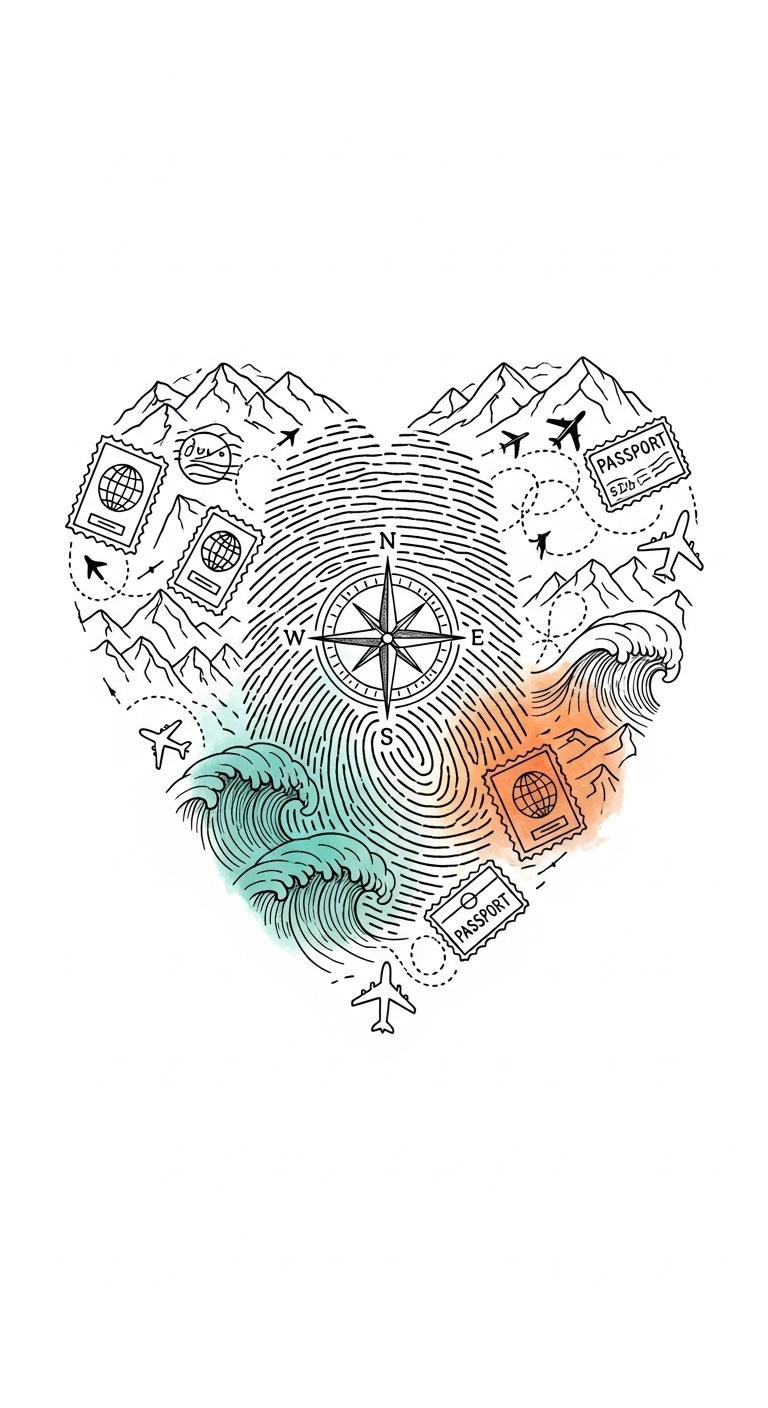 The fingerprint-heart symbolizes identity shaped by travel, passport stamps and routes represent milestones and direction, while watercolor hues evoke emotional warmth and sea-sky horizons; ideal placements are the inner forearm or ribcage to keep it personal and close to the heart, with fine-line execution to preserve intricate details.