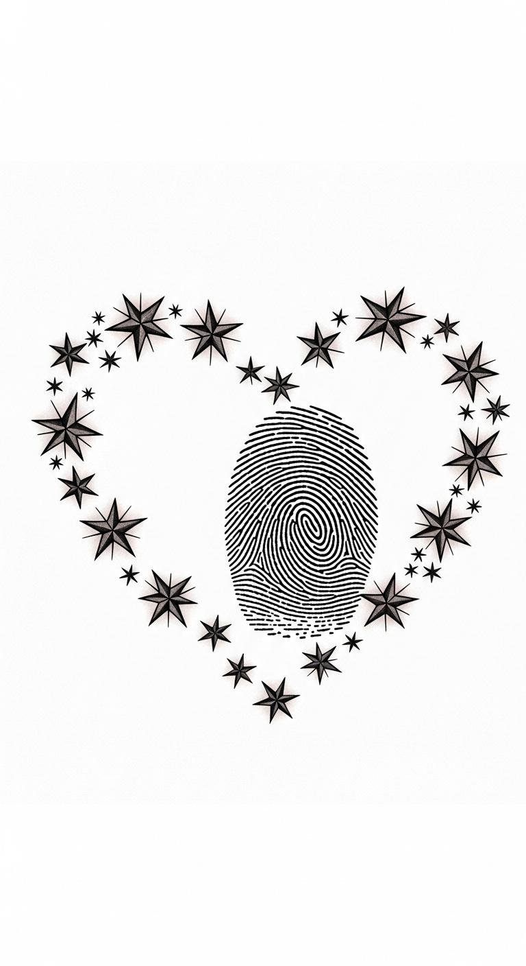 This design combines intimate symbolism and gentle motion: the heart shape sits centered with small, scattered stars arcing from one side toward the top, and a subtle fingerprint pattern filling or overlaying part of the heart to emphasize individuality.