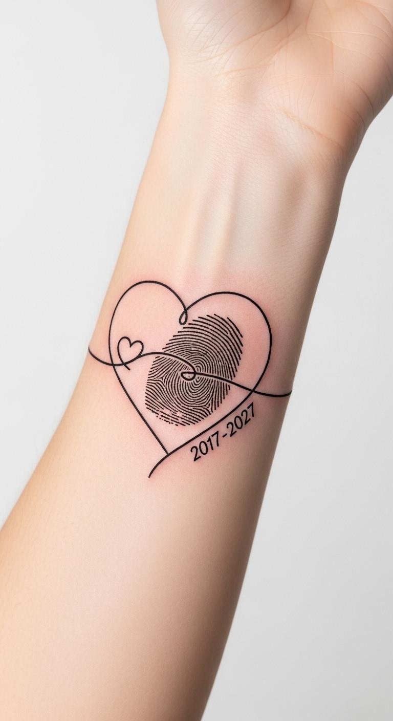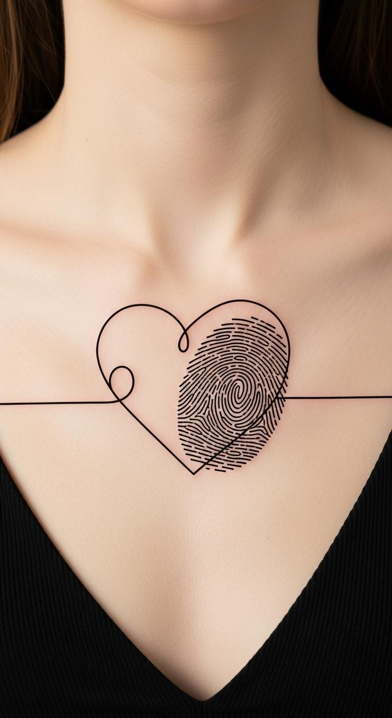 This design pairs the intimacy of a fingerprint with the universal heart symbol to convey identity and connection; its restrained execution evokes quiet confidence and can be placed on wrists, inner forearm, behind the ear, or along the collarbone for a private yet visible reminder of love and selfhood.