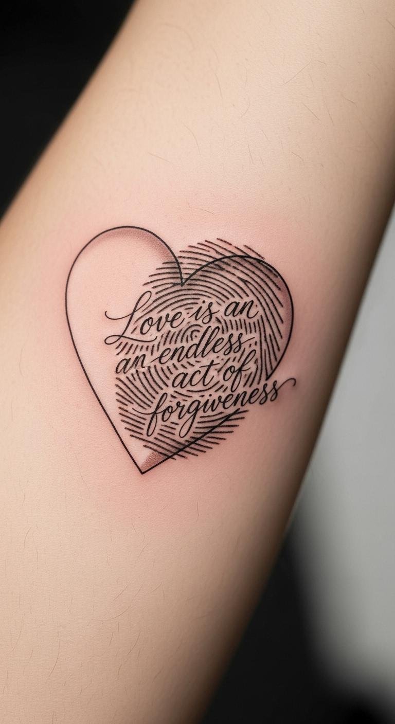 Imagine a tattoo that weaves together a heart, your unique fingerprint, and a personalized quote that resonates with you—this trifecta perfectly captures your essence and the relationships that shape your life.
