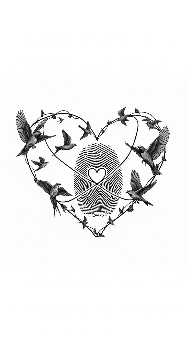 There’s something enchanting about a heart adorned with birds and a fingerprint, as it beautifully captures the essence of love and freedom. This design intertwines bird tattoo symbolism, representing your desire to soar while keeping love close. Each fingerprint adds a unique touch, making it a perfect heart design inspiration for those embracing their individuality and the bonds that define them. The heart center formed by a delicate fingerprint suggests personal identity and permanence, while small birds breaking from its curves convey motion, liberation, and shared journeys; ideal placements include the inner wrist for intimacy, over the chest for emotional closeness, or along the ribcage for a private, flowing statement.