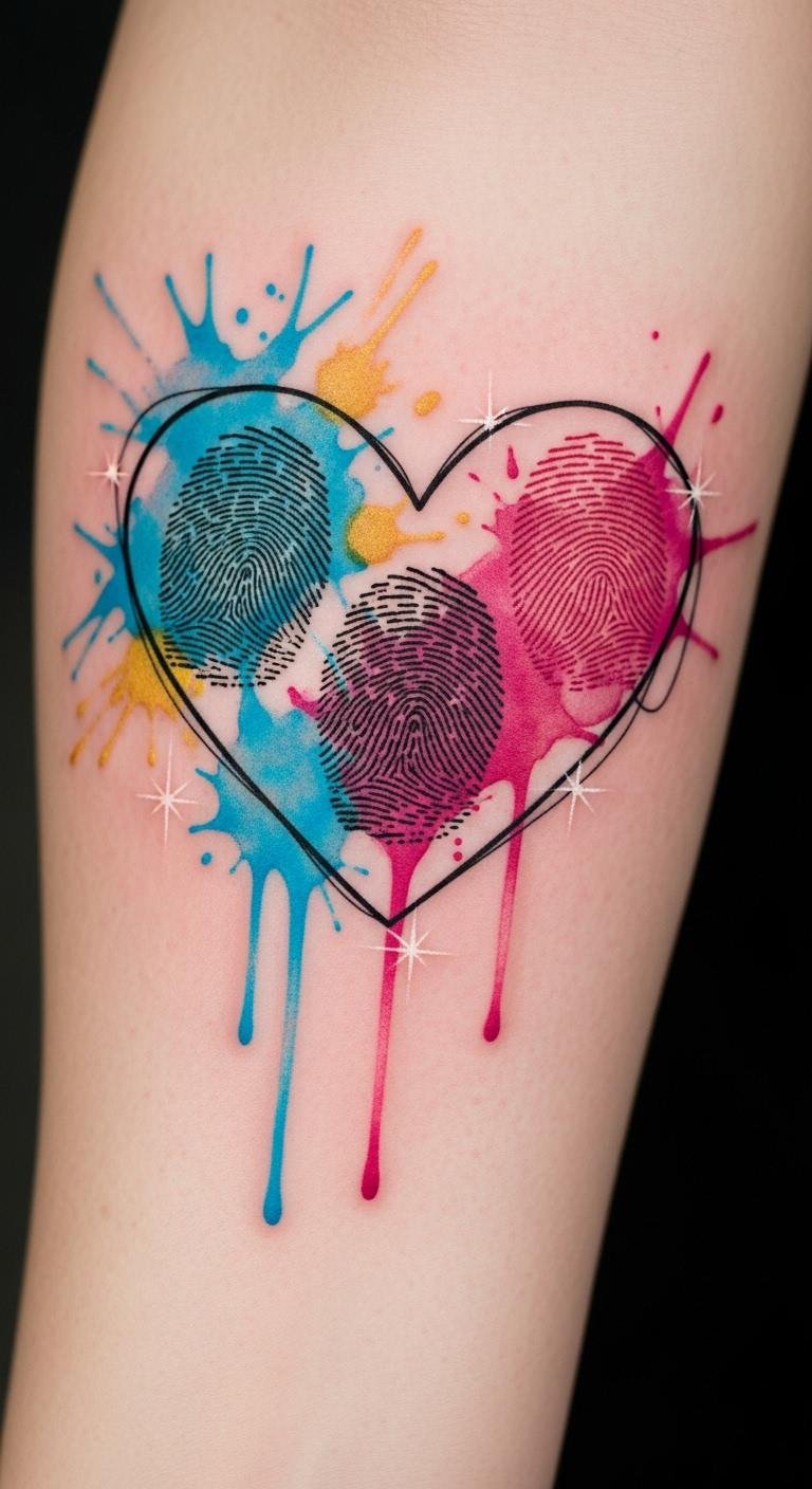 The design symbolizes individuality merging with love—the fingerprints represent identity and connection while the watercolor washes convey emotion, movement, and vulnerability; emotionally it feels intimate and expressive, suited for visible areas like the inner forearm, chest near the heart, or shoulder blade where its colors can be appreciated and easily cared for during healing.
