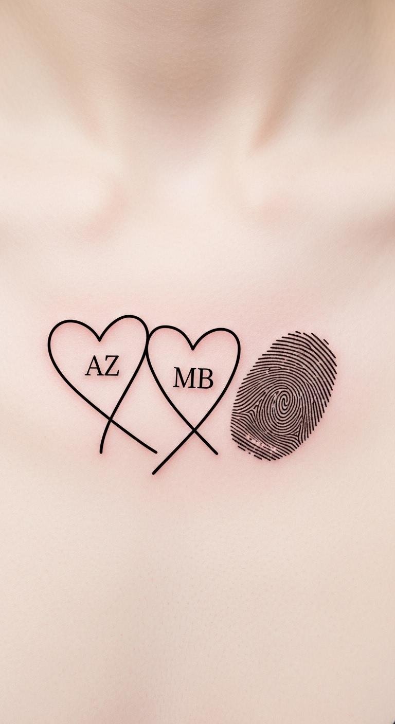 Three elements—heart, initials, and fingerprint—come together in the simple heart design, creating a powerful symbol of love and identity. Your initials carry significance, representing a bond that’s uniquely yours, while the fingerprint artistry showcases your individuality. This minimalist tattoo not only embodies affection but also celebrates personal freedom, making it a timeless tribute to the connections that shape your life. The compact composition—heart outline filled subtly with a single fingerprint swirl and discreetly integrated initials—speaks to intimacy and permanence; place it on the inner wrist, chest near the collarbone, or behind the ear to evoke quiet devotion, personal history, and the tactile memory of touch.
