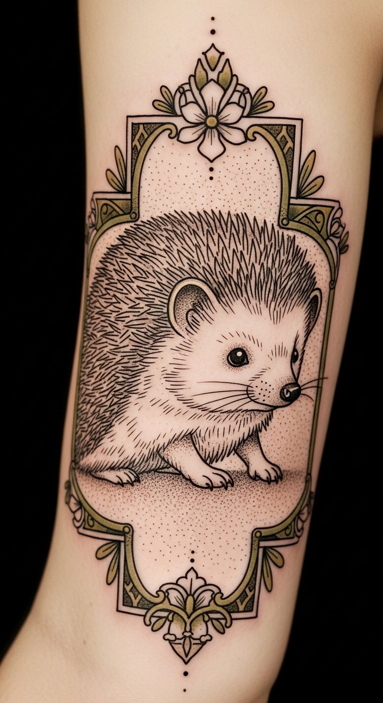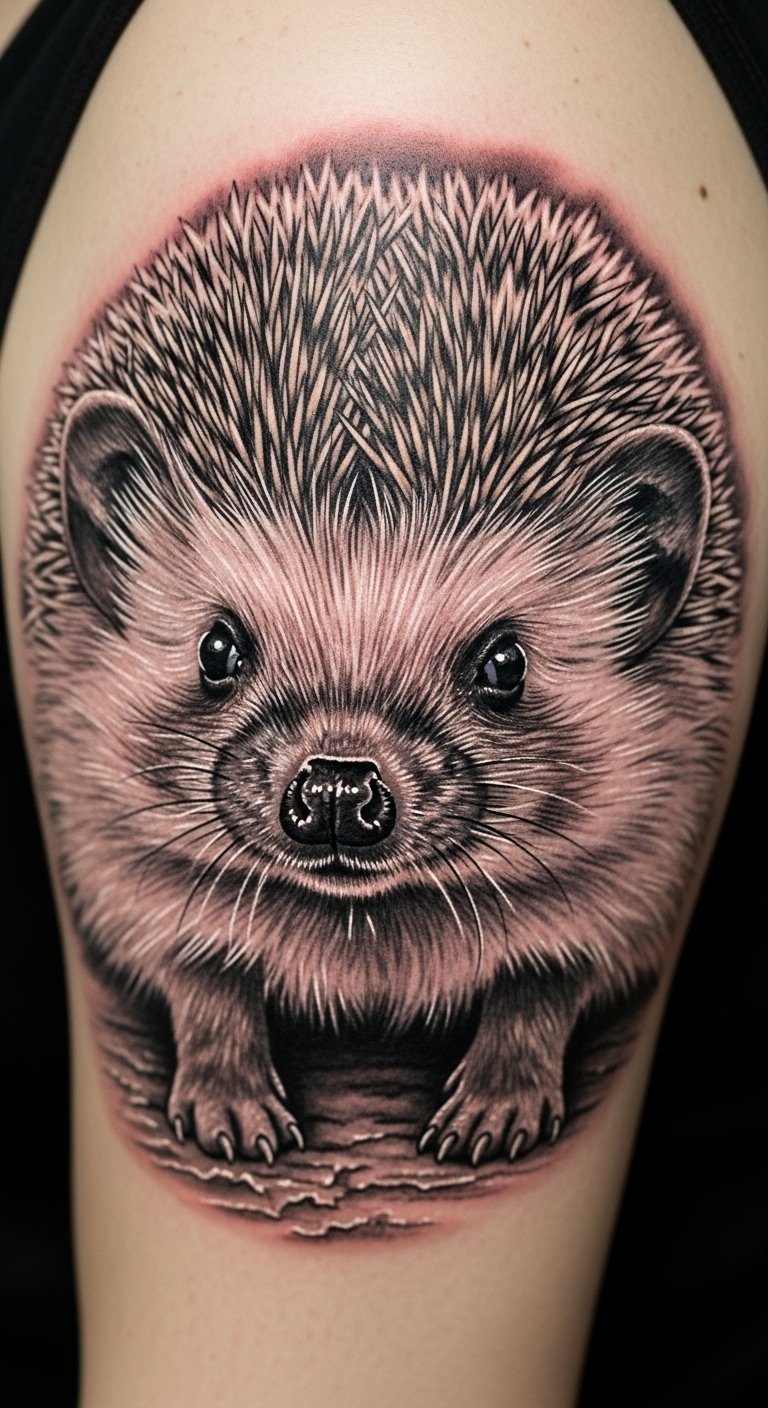 This art form allows you to express your individuality, embracing your love for these endearing animals while celebrating your freedom. The design emphasizes resilience and gentle protection, evoking warmth and quiet strength; ideal for placements like the forearm, shoulder blade, or ribcage where the portrait can be sized to show quill detail and flow with natural contours, creating an intimate, personal emblem.