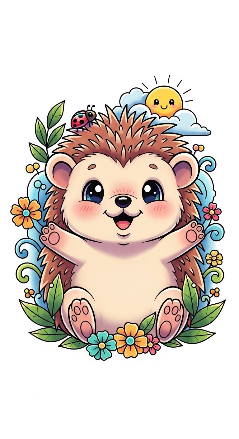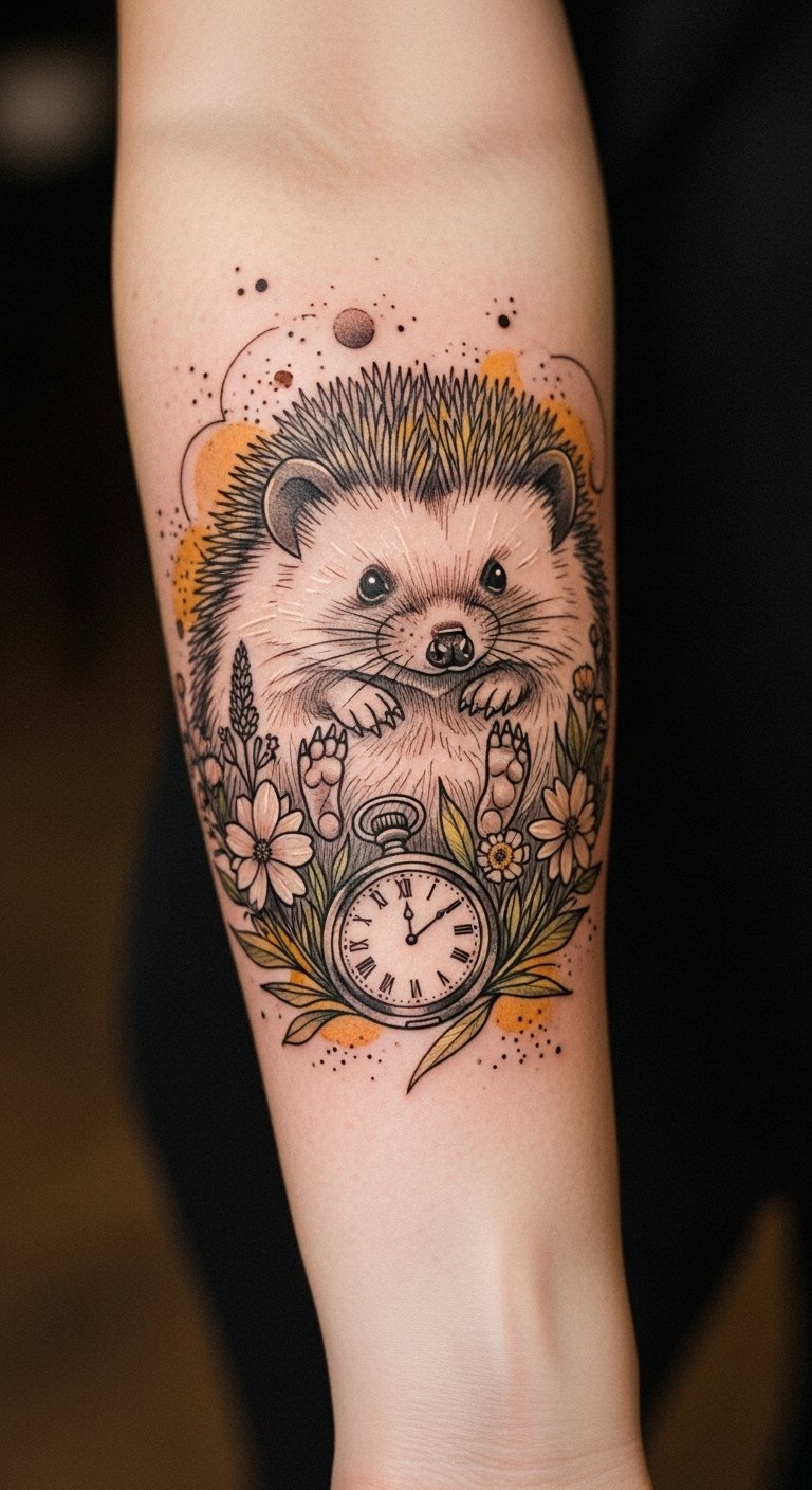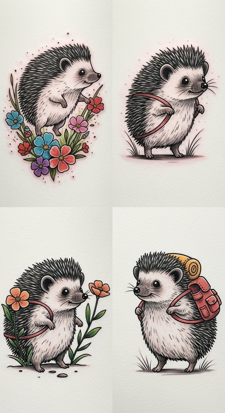 These playful hedgehog elements symbolize curiosity, resilience, and the joy found in small moments; bright colors and dynamic poses evoke lightheartedness and movement, making the design ideal for places that catch the eye—forearm, calf, shoulder blade, or ankle—so each glance reminds the wearer of adventure, protection, and a carefree spirit.
