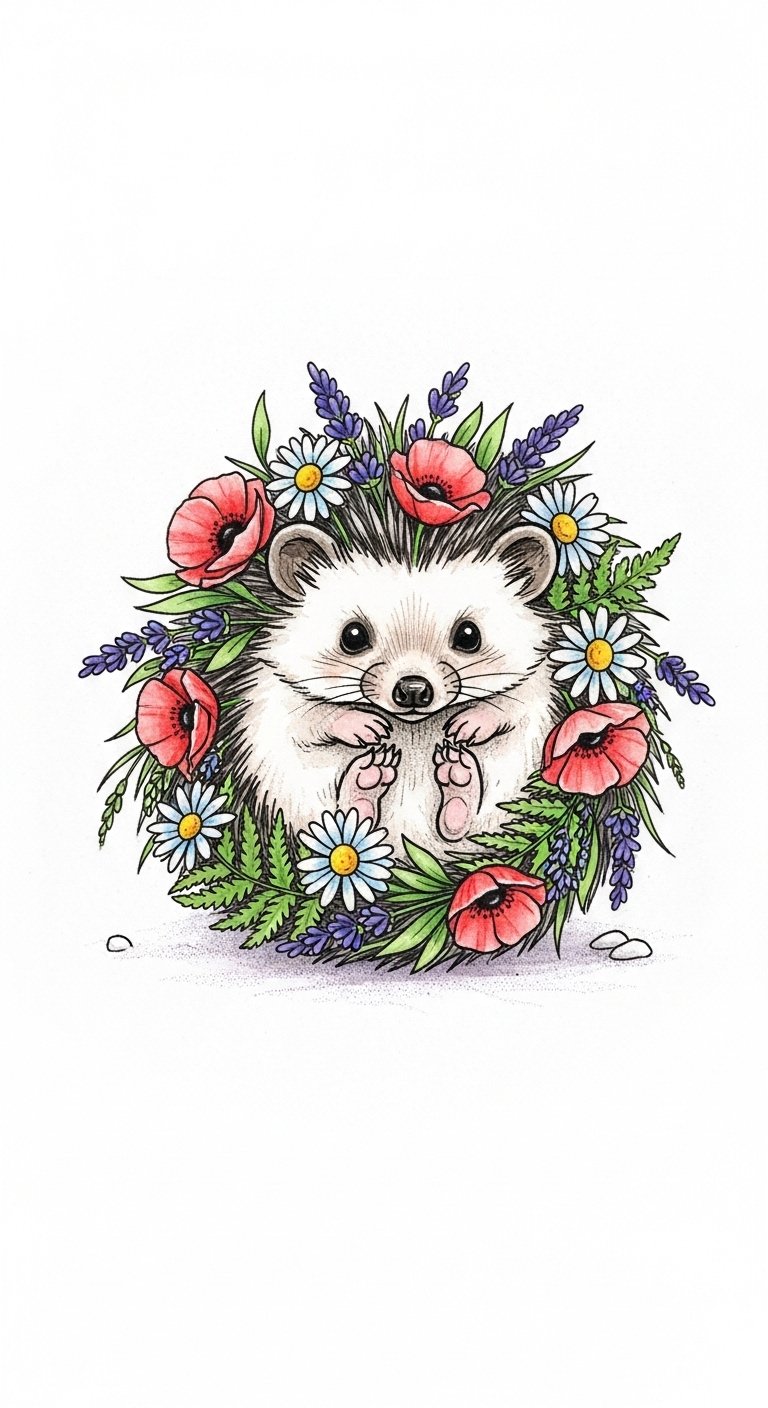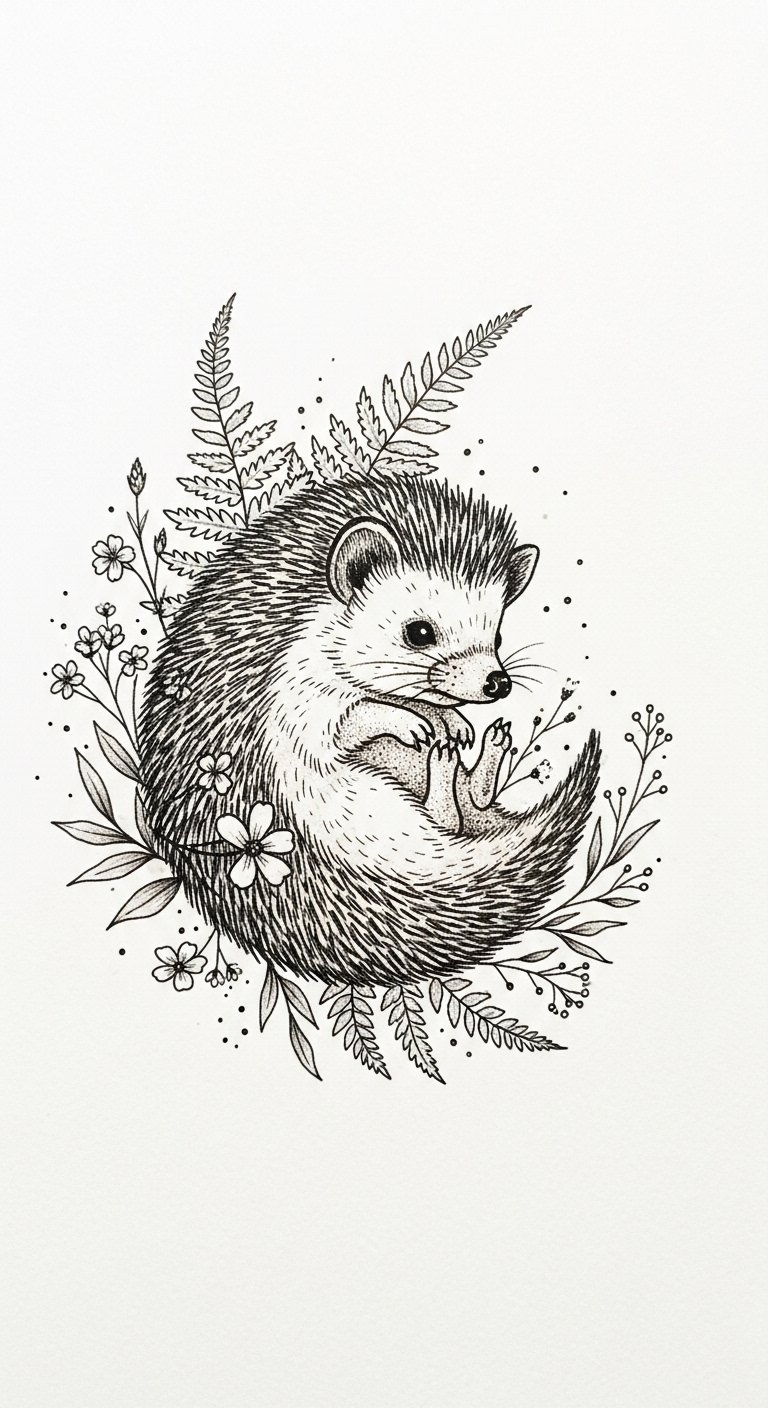 This design concept uses the original wording to inspire a compact tattoo: a small, curled hedgehog cradling a spray of wildflowers—daisies, lavender, and tiny roses—outlined with fine line detail and selective watercolor splashes for vibrant accents. Symbolically it balances protection and curiosity (the hedgehog) with joy, freedom, and delicate beauty (the flowers), evoking warmth, playfulness, and gentle resilience. Ideal placements include the inner forearm, ankle, or shoulder blade where the curved composition follows natural contours and can be scaled from a subtle, intimate piece to a cheerful statement.