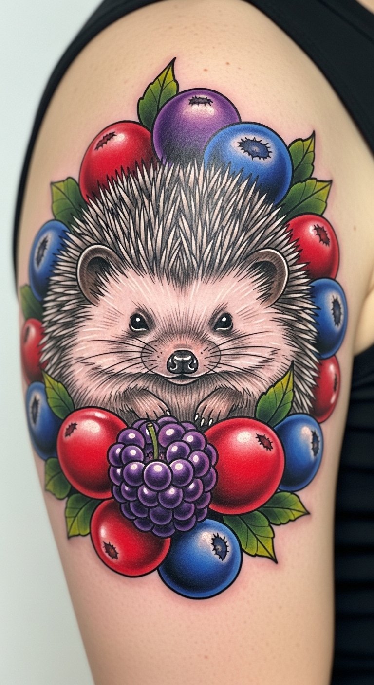 This composition blends tenderness and resilience, evoking warmth, comfort, and a playful bond with the natural world; it suits a forearm, shoulder blade, or calf where the round shapes of berries and the hedgehog’s form can flow with musculature and movement.