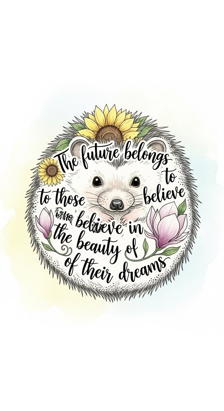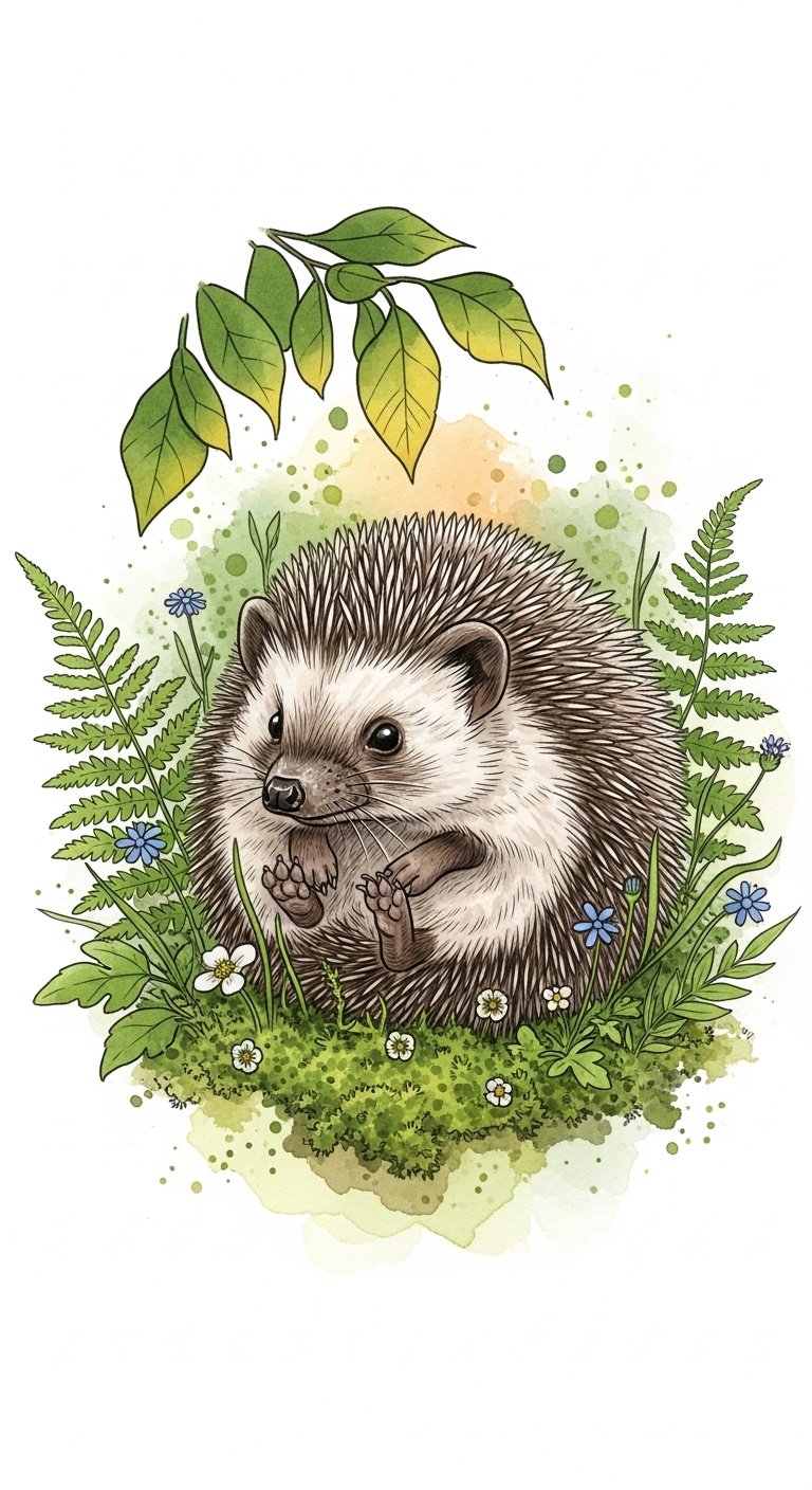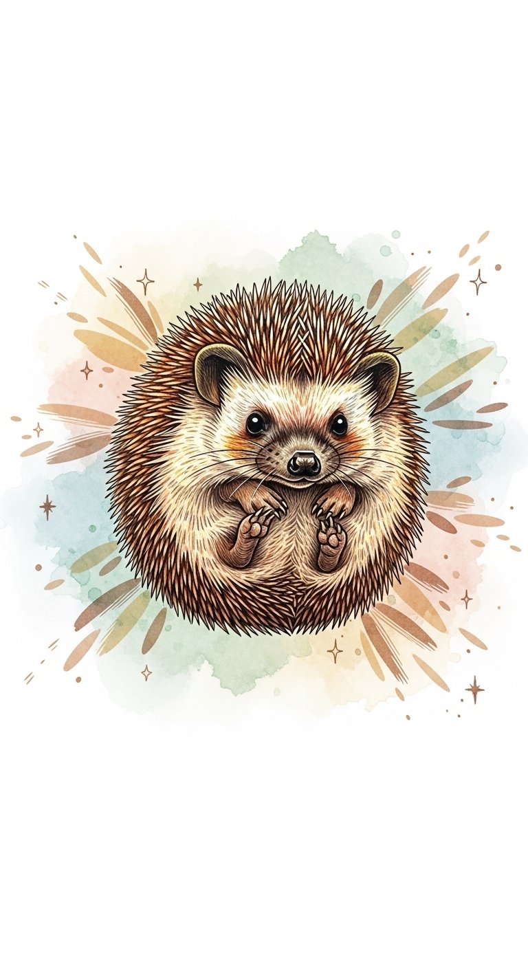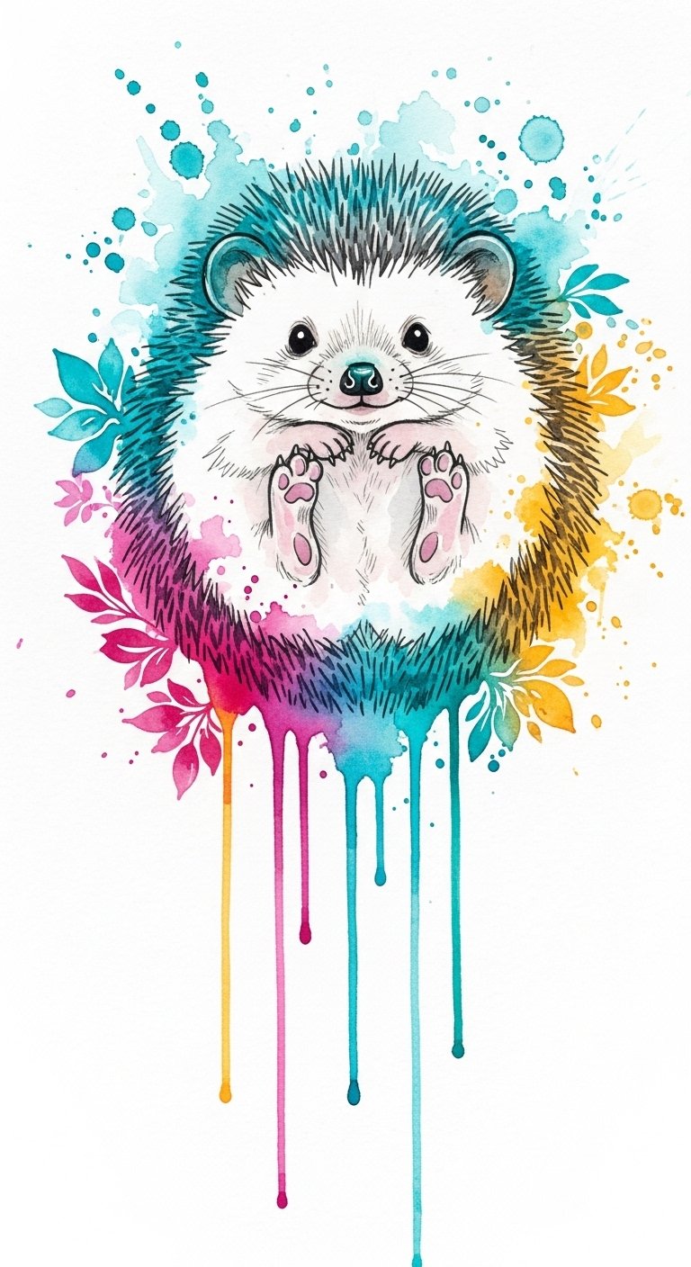 This design symbolizes playfulness, resilience, and individuality; the flowing watercolor evokes freedom and emotional warmth while the hedgehog’s curled pose represents protection and inner strength.
