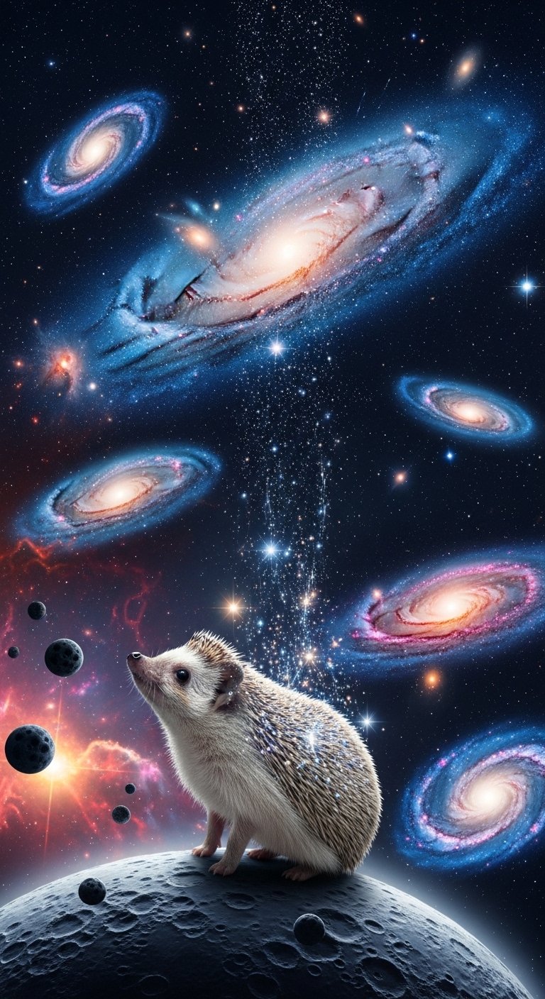 This design symbolizes curiosity, wonder, and a yearning for exploration; the hedgehog represents grounded resilience while the stars and galaxies signify limitless possibility and personal freedom.