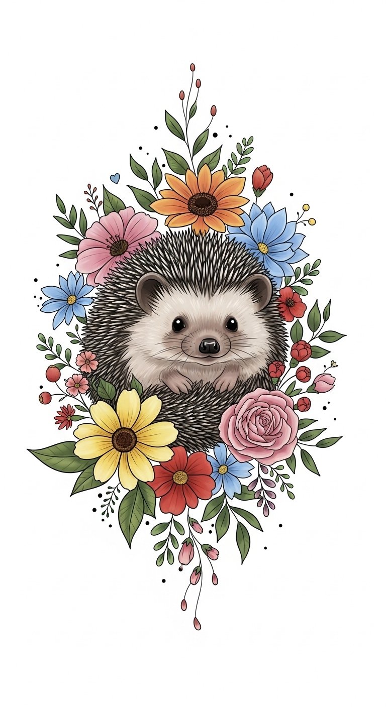 The floral hedgehog symbolism reflects resilience and nurturing, while vibrant hedgehog blooms add a splash of color and life. Choosing this design allows you to express your unique spirit, celebrating both whimsy and strength in a truly fascinating way.