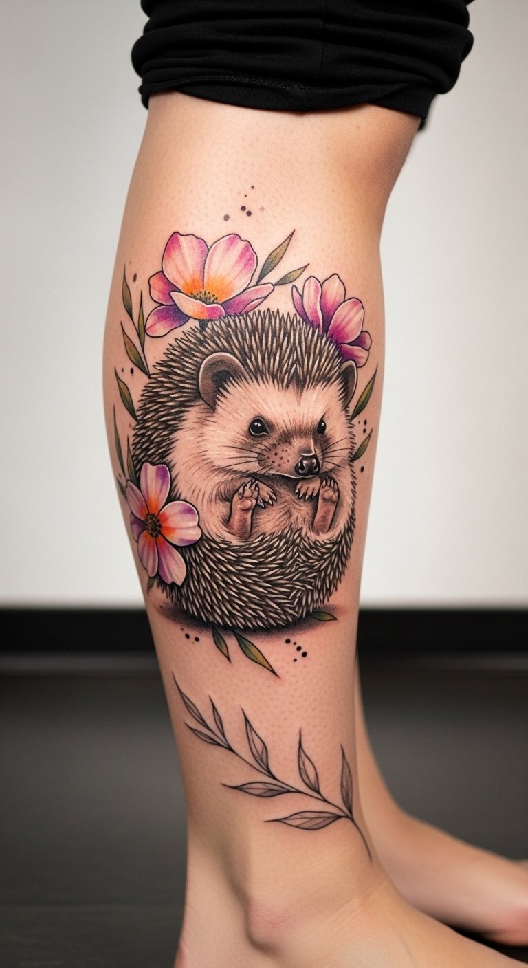 With thoughtful hedgehog placement, your hedgehog calf tattoo draws attention, combining intricate calf design and vibrant hedgehog shading.
