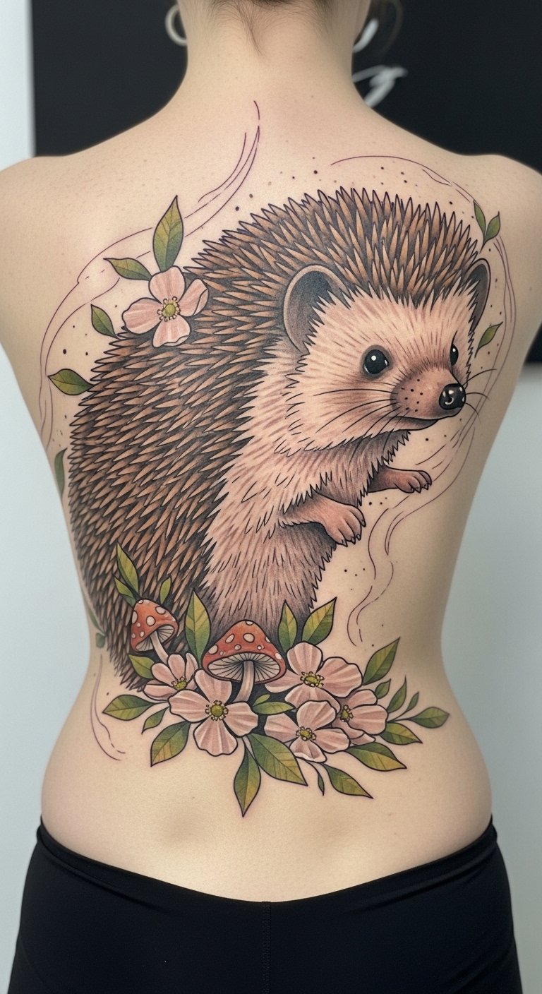 A stunning back design featuring a large hedgehog can transform your body into a canvas of whimsical artistry.