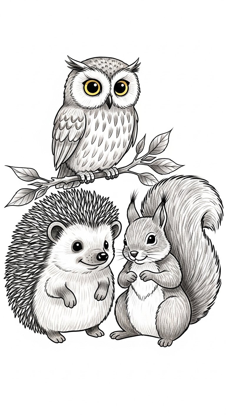 This design pairs a small, endearing hedgehog with a playful squirrel perched nearby or a wise owl overhead, using soft lines and natural colors to evoke warmth and whimsy; it symbolizes friendship, curiosity, and the harmony of different personalities in nature, conveying a carefree, joyful emotion; ideal placements include the forearm, calf, or shoulder blade where the composition can flow with movement and be easily shown or concealed.