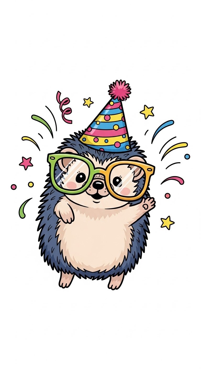 A small, colorful hedgehog tattoo with exaggerated quills in rainbow hues, wearing a tilted party hat and round oversized glasses, surrounded by tiny confetti and stars; fine-line details, soft watercolor shading, suitable for wrist, ankle, or behind the ear, about 2–3 inches, playful yet refined. This design symbolizes lightheartedness, joy, and personal freedom—sparking smiles and encouraging imagination whenever seen; ideal for a spot that’s easily shown to share cheer or hidden for a private reminder to embrace whimsy.