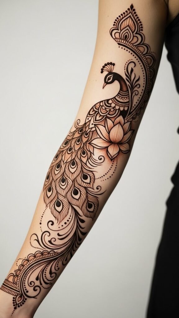As the henna dries, you’re not just adorning your skin; you’re connecting with centuries of artistry and expression that embody the spirit of freedom and celebration in Indian culture. The concept translates these elements into a permanent tattoo: the peacock symbolizes beauty and pride, the lotus represents purity and rebirth, and the flowing paisley vines evoke life’s continuity.