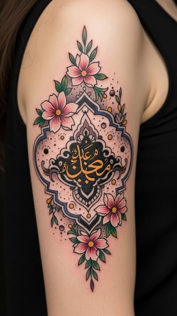 The design concept blends classic Arabic floral motifs—stylized roses, arabesque vines, and geometric tile elements—flowing along the forearm or collarbone to evoke grace and continuity; color choices emphasize deep indigo, gold, and emerald for a timeless, luxurious feel, while delicate dotwork and thin line detailing lend modern lightness. Symbolically, the arrangement represents personal growth, cultural roots, and seasonal renewal, eliciting feelings of connection, resilience, and quiet pride; ideal placement follows natural contours (inner forearm, shoulder blade, or ribcage) to allow both private reflection and elegant display.