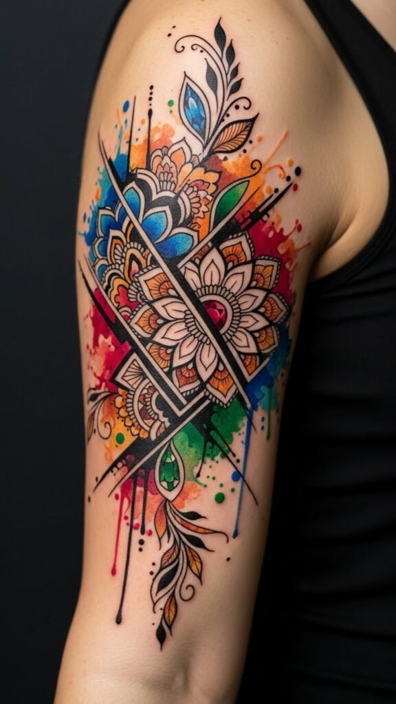 The design symbolizes the meeting of heritage and personal evolution—mandalas for unity and balance, vines for growth, geometric elements for modern structure, and watercolor splashes for emotion and freedom; it evokes confidence and connectedness, suitable as a forearm wrap for visibility and daily empowerment or as a shoulder piece for a more intimate, elegant statement.