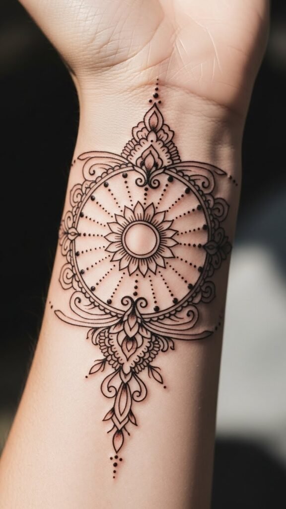 From intricate mandalas to flowing vines, these designs not only enhance your look but also embody your unique story, making every glance at your wrist a reminder of your freedom. This design centers the mandala over the inner wrist to symbolize balance and centeredness, with vines suggesting growth and continuity; the lace edges evoke femininity and protection.