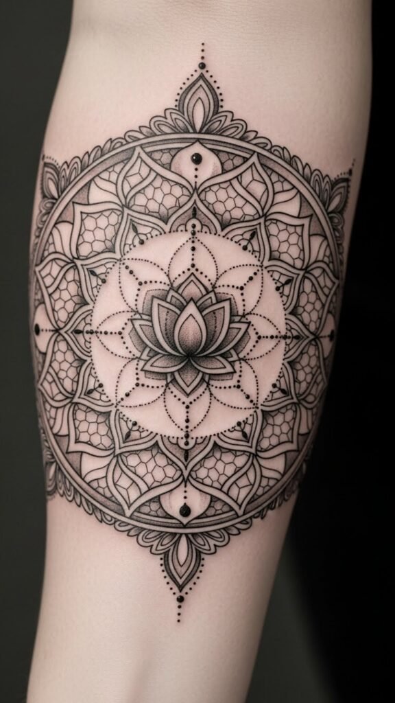The design symbolizes unity, balance, and an inward journey: the net patterns represent interconnectedness, the central lotus denotes spiritual awakening, and the layered petals suggest gradual unfolding of self-discovery; emotionally it aims to evoke calm, centeredness, and personal freedom, with the fine dotwork and negative space offering meditative detail;
