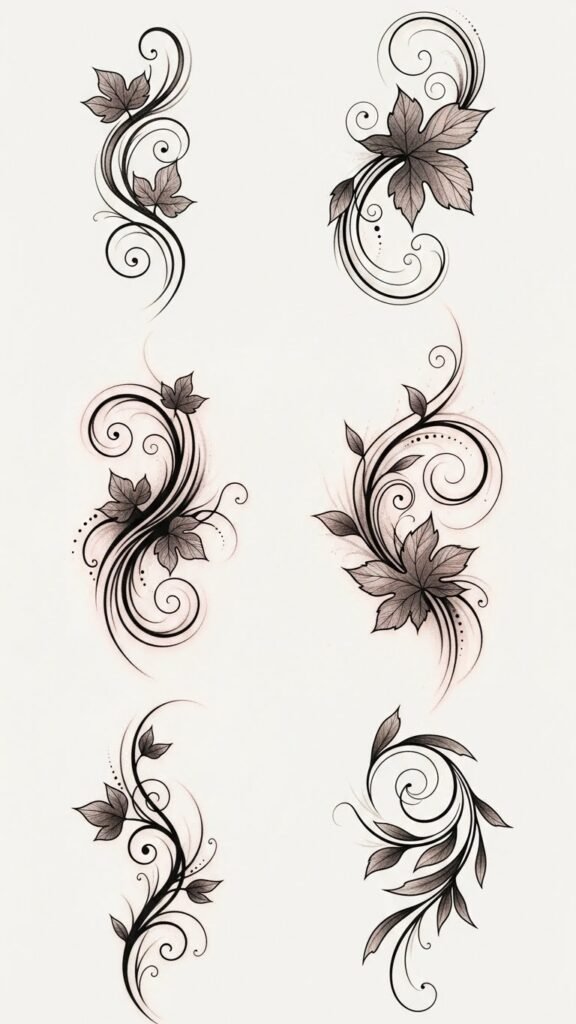 Vine and leaf motifs convey themes of growth, resilience, renewal, and freedom; the flowing lines and interwoven leaves evoke a sense of continuous personal evolution and gentle strength.