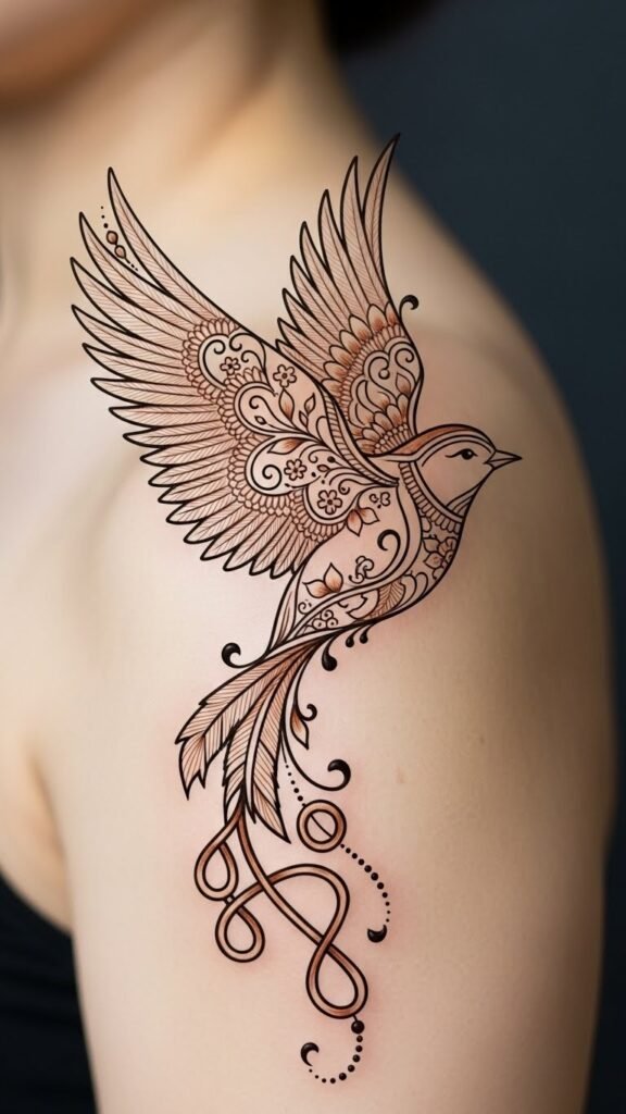 Adorning your skin with these designs invites a sense of liberation and unity. The bird’s upward motion symbolizes hope and release, while the intertwining vines and knots express intertwined relationships and personal roots; place on the shoulder for mobility and visibility or along the collarbone for a more intimate, elegant statement.