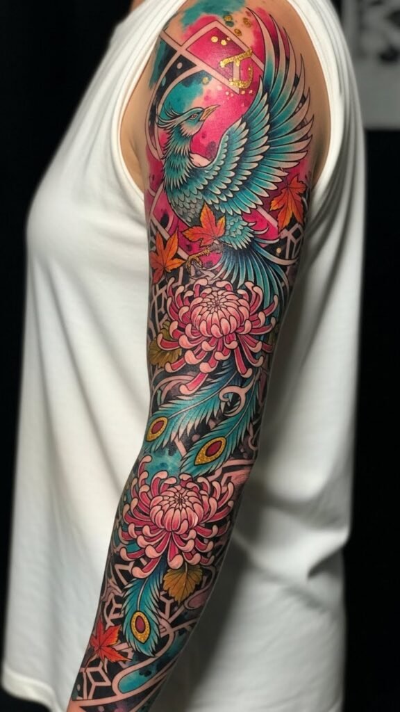 A sleeve that fuses rebirth (phoenix) and resilience (chrysanthemum) symbolizes personal transformation and enduring strength; geometric patterns and seasonal elements represent life’s cycles and cultural roots, while bold watercolor splashes convey emotion and freedom.