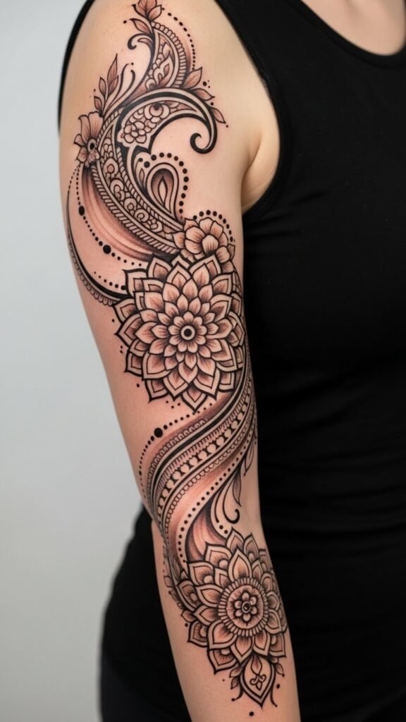 This design concept blends intricate traditional paisley and mandala elements with modern negative-space geometry, placed as a flowing forearm sleeve that wraps from wrist to elbow; delicate floral motifs interlace with bold chevrons to balance softness and strength, invoking cultural heritage, personal transformation, and confident self-expression while the placement allows visibility and intimacy—visible to the wearer and others—evoking pride, connection, and a contemplative sense of identity.