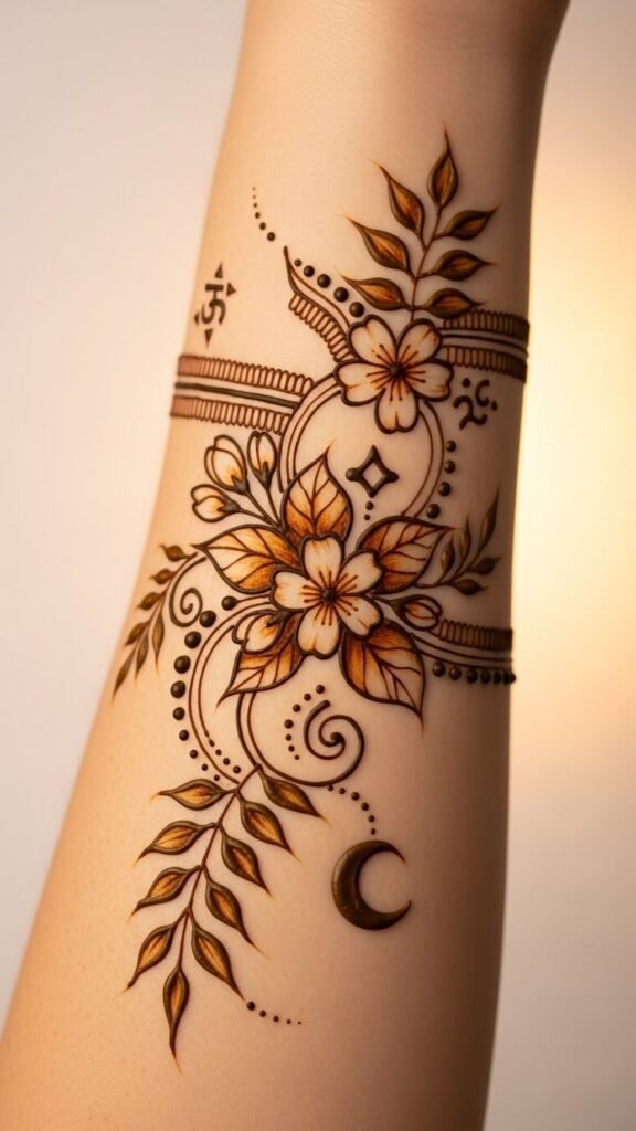A gentle, protective design meant for the inner forearm, the botanical motifs symbolize natural care and healing—jasmine for purity and calm, neem for protection, vines for growth and resilience—while the crescent near the wrist evokes cycles and gentle change; the fine lines and negative space convey sensitivity and respect for the skin, suggesting calmness and reassurance; ideal placement is the inner forearm where visibility supports mindful aftercare and easy monitoring for any skin reactions, making it both an emblem of beauty and a reminder of careful, health-conscious application.