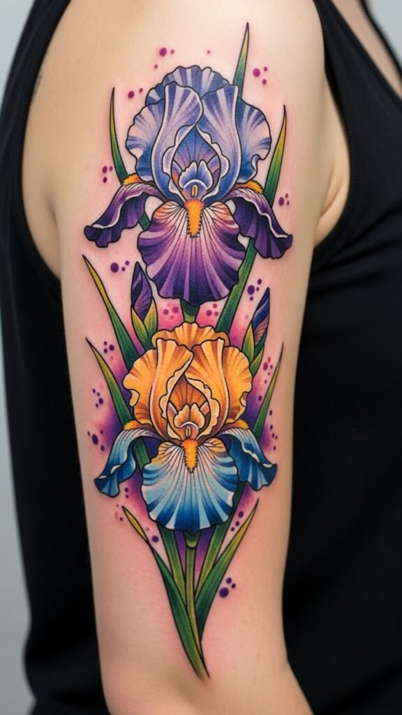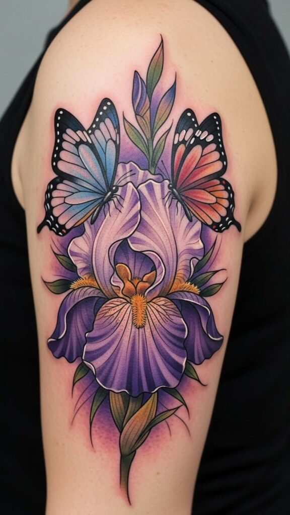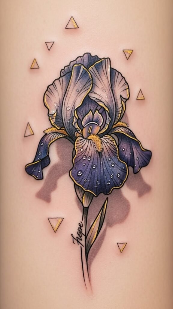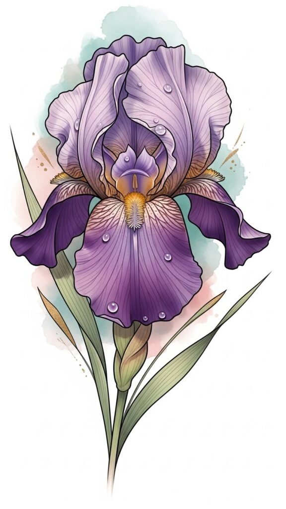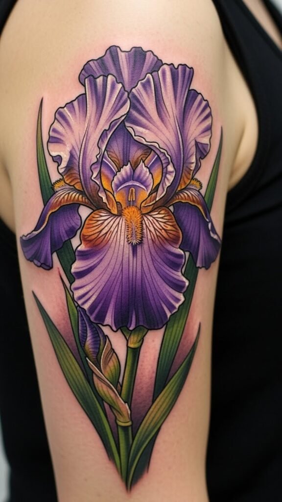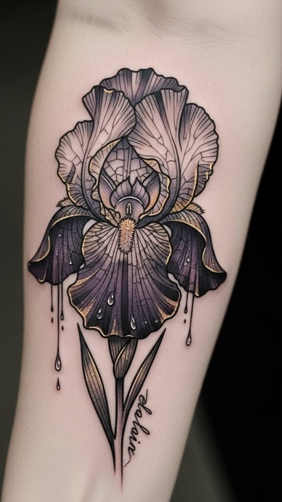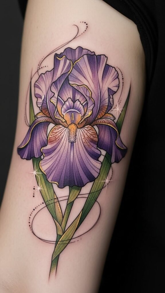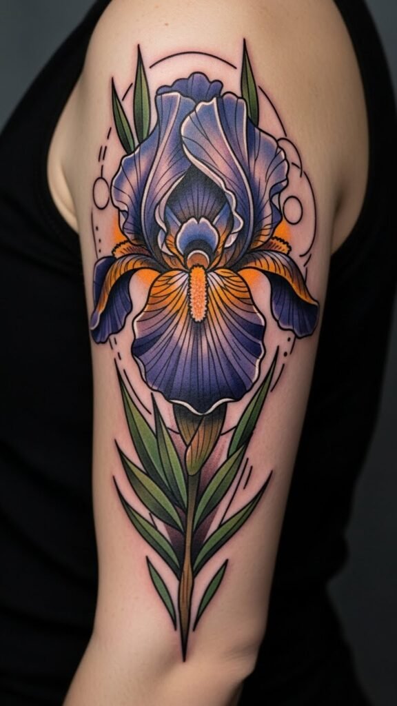 This neo-traditional iris tattoo concept centers on a single oversized iris in full bloom, rendered with bold black outlines, layered petals in gradient purples and teals, and accents of warm gold and coral to evoke spring’s warmth.