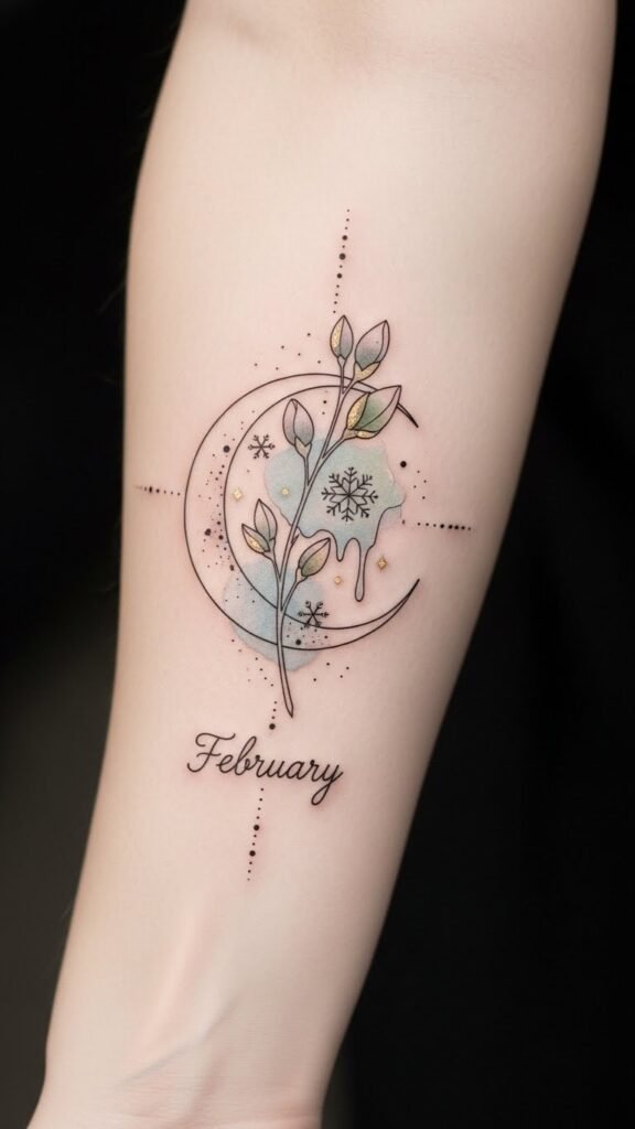 The design blends lunar and botanical elements to symbolize cycles and emerging life, evoking quiet hope and gentle resilience; fine lines and soft watercolor convey vulnerability and renewal, ideal for inner forearm or wrist placement where its intimate message can be seen and felt.