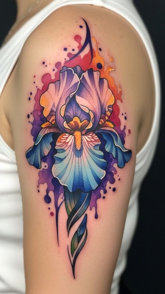 Watercolor iris tattoo concept: a single large iris in loose, flowing watercolor style with layered washes of cobalt, magenta, and lemon yellow bleeding into one another, soft edges, subtle splatters and light brushstroke texture, fine black ink outlines for select petal veins, negative-space highlights, placement suggested along the outer forearm or upper back for full gradient display. This design symbolizes renewal and individuality—the iris’s layered colors and fluid blending evoke emotional depth, personal growth, and the freedom to express creativity; on the forearm it reads as an open, visible statement of identity, while on the upper back it feels more intimate and contemplative.