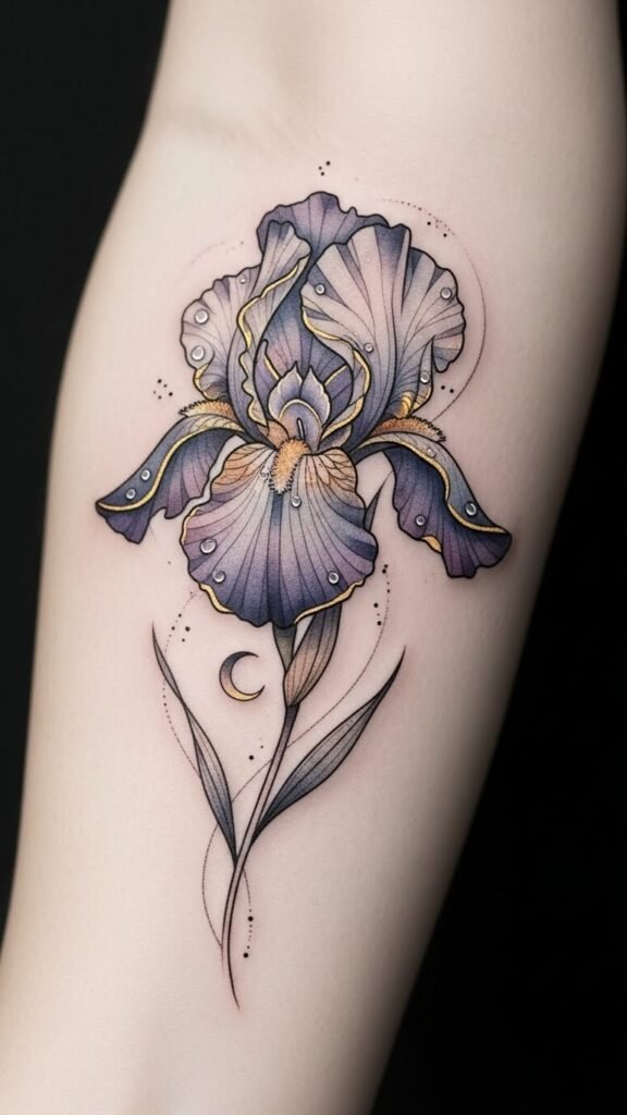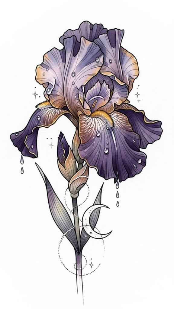 This tattoo concept pairs celestial motifs—stars, crescent moons, and subtle nebula swirls—with detailed iris blooms, using fine-line shading and soft color washes for depth.