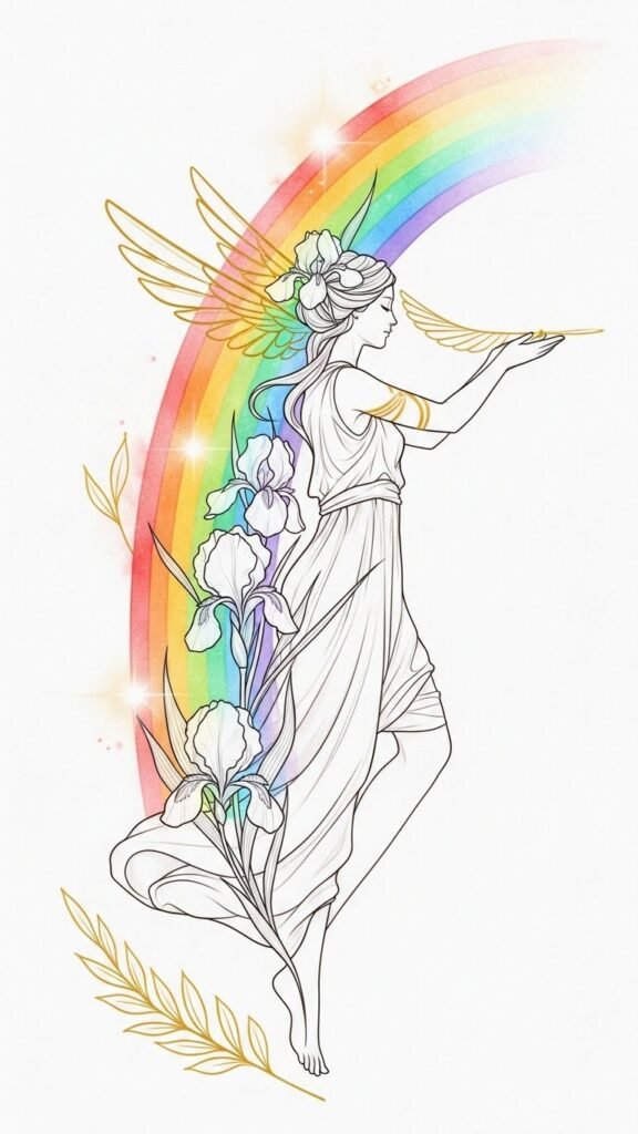 This tattoo concept melds the rainbow’s bridging light with iris blossoms to symbolize hope, communication, and spiritual passage; the gentle, flowing composition evokes serenity and uplift, ideal as a shoulder blade piece that reads across the back or as a vertical forearm wrap to follow the arm’s natural movement, allowing color gradients and fine lines to convey emotion and narrative.