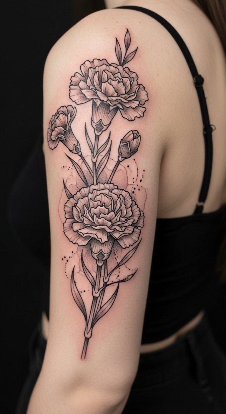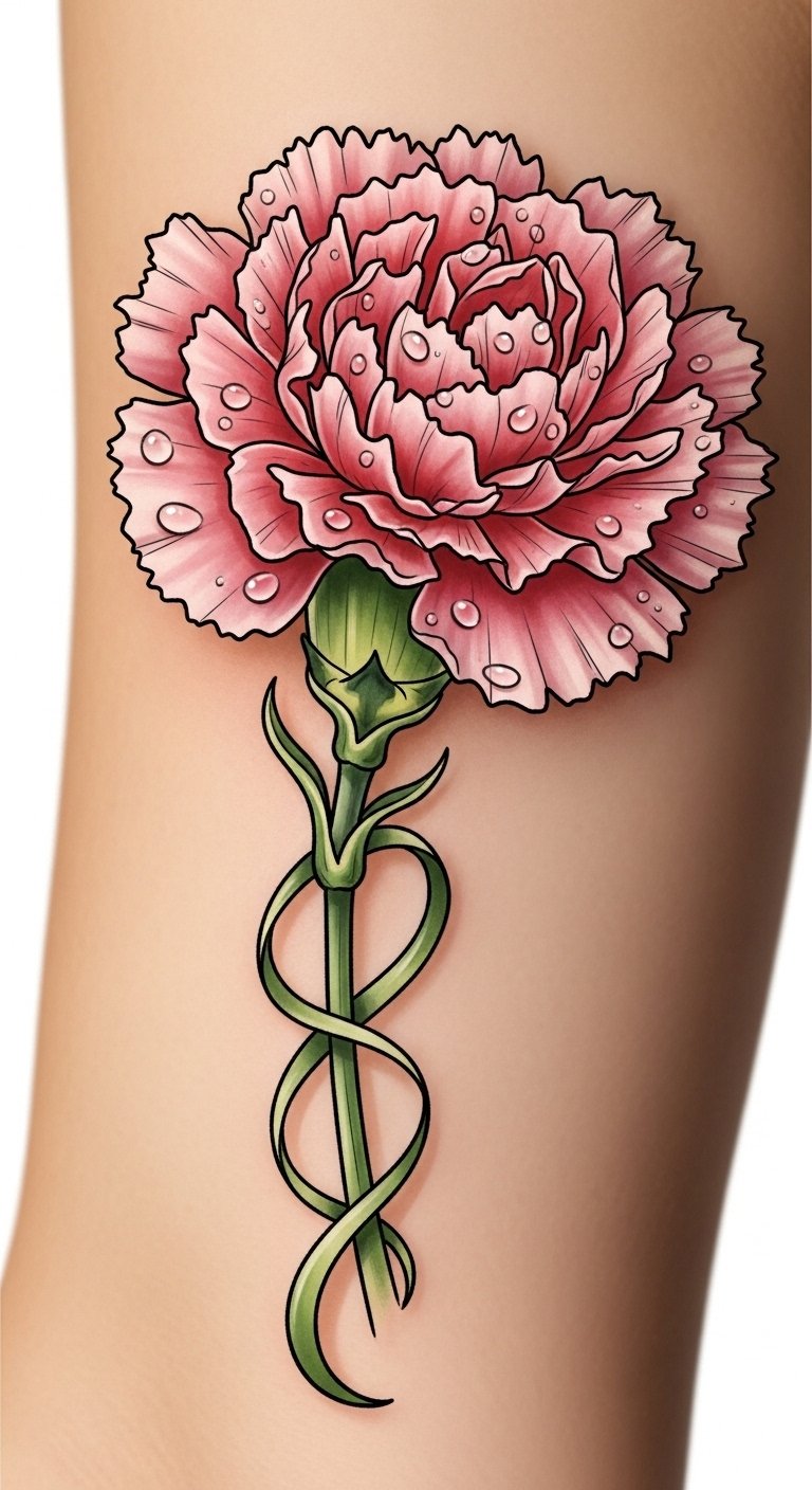 Carnations symbolize deep affection, remembrance, and individuality; placed on the ribcage the design becomes a private bloom revealed selectively, conveying intimacy and personal strength, while placement on the back of the arm turns the flower into a statement of openness and visible grace.