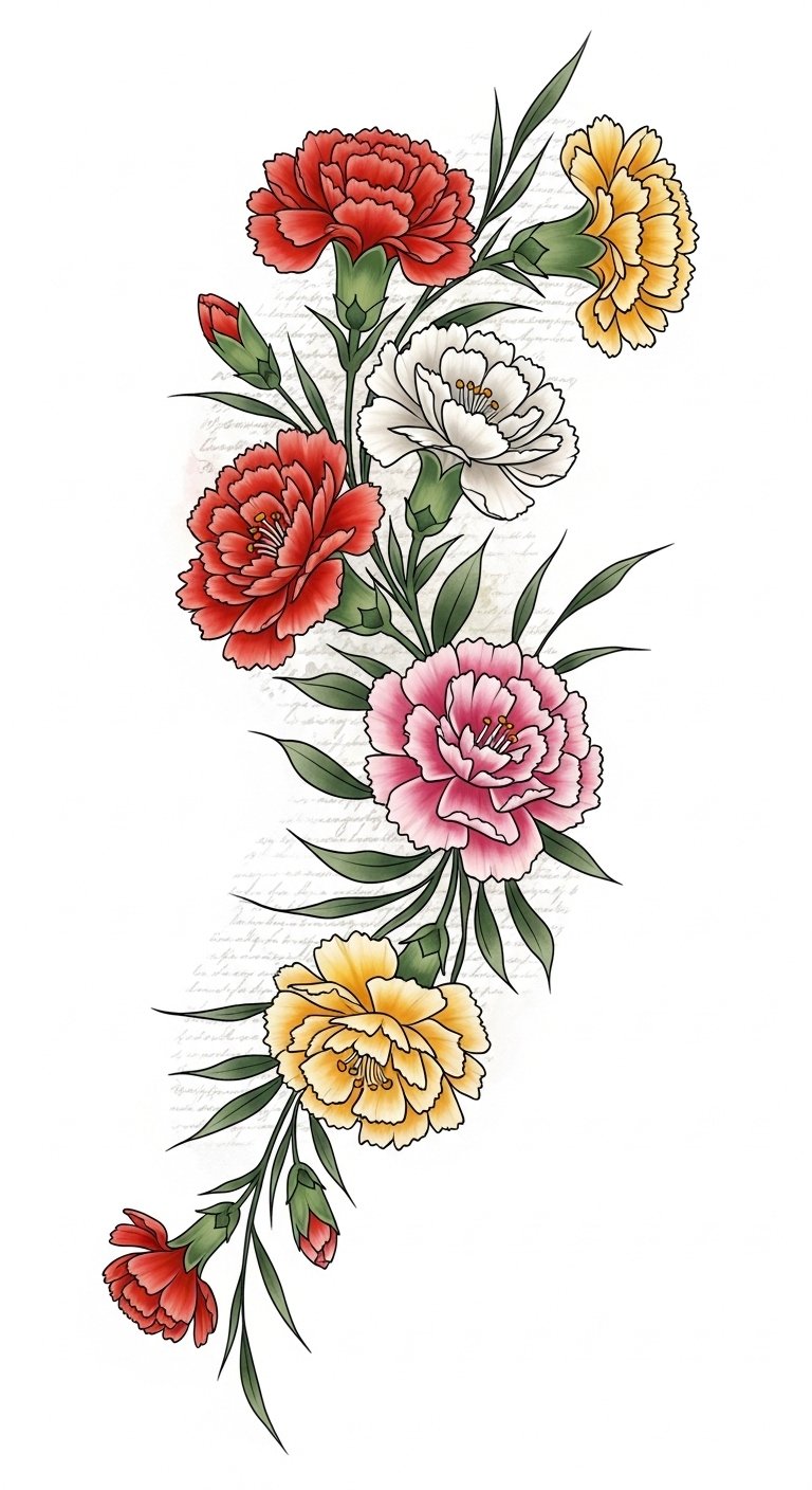Although every carnation carries a unique beauty, their colors deepen their significance, transforming them into powerful symbols in tattoo art.