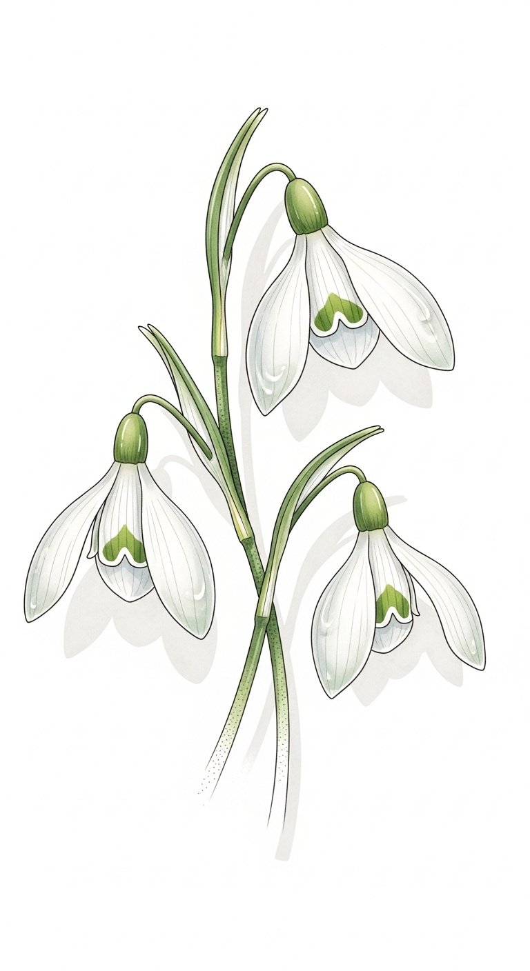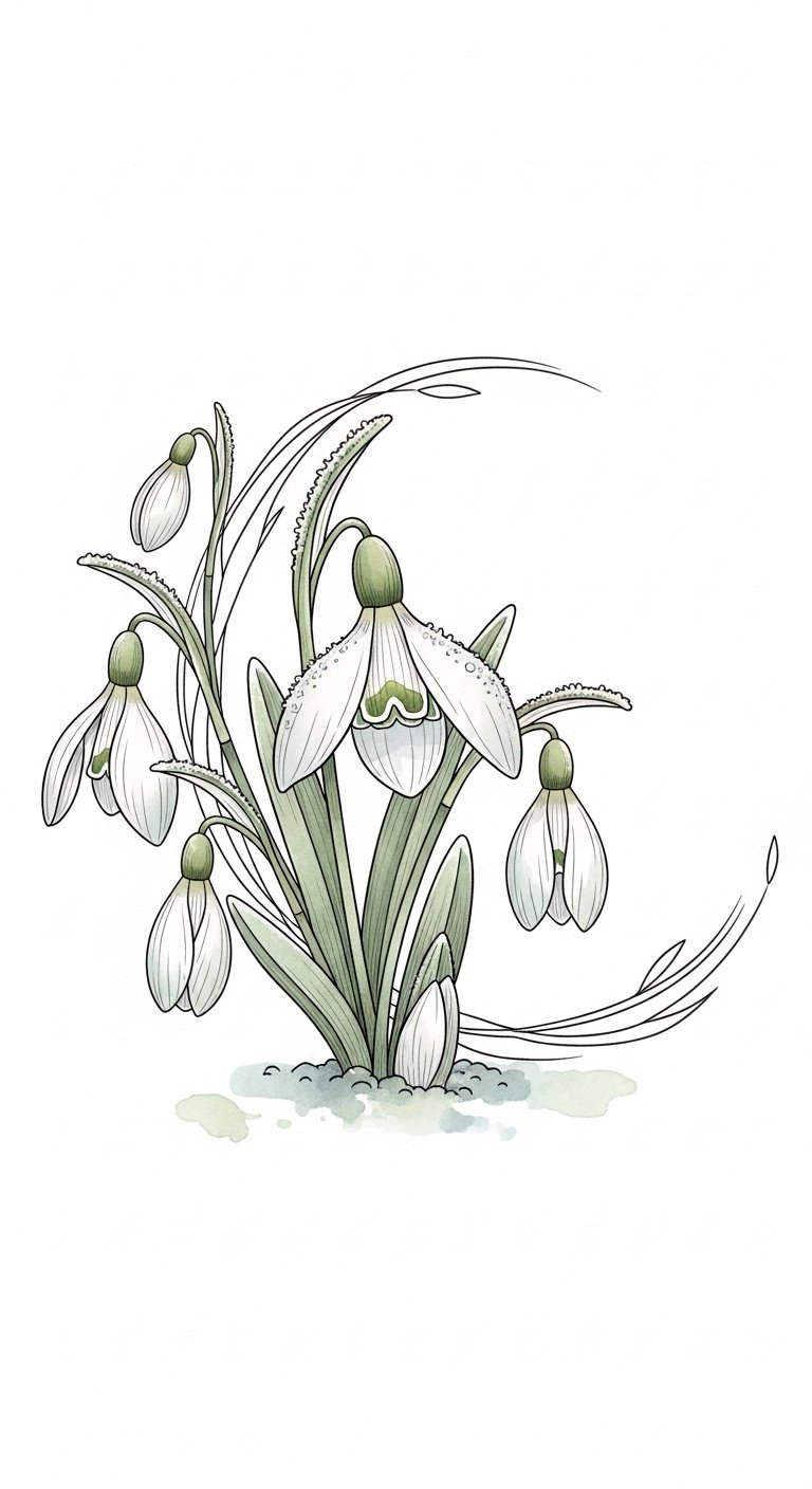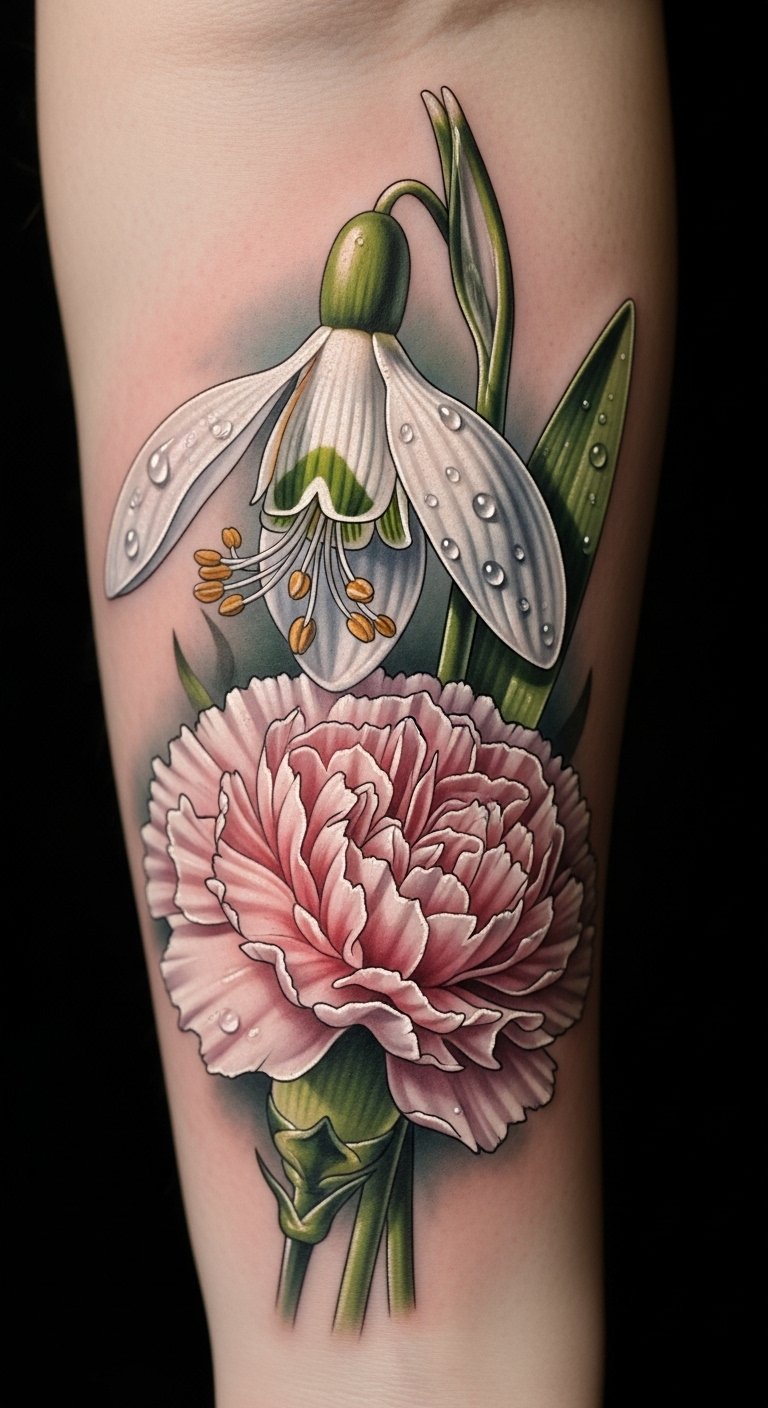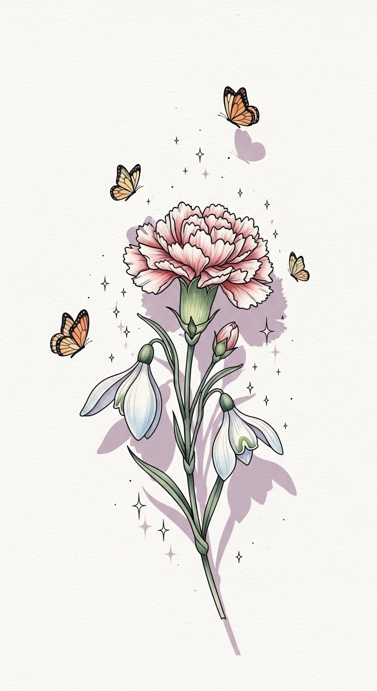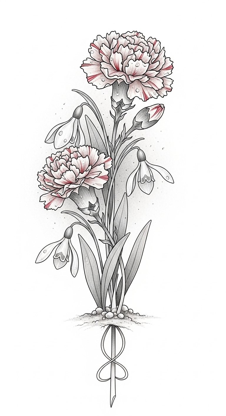 Each petal and leaf tells a story in this design: the snowdrop symbolizes hope and new beginnings while the carnation embodies deep love and admiration, together conveying resilience and heartfelt warmth in cold months.