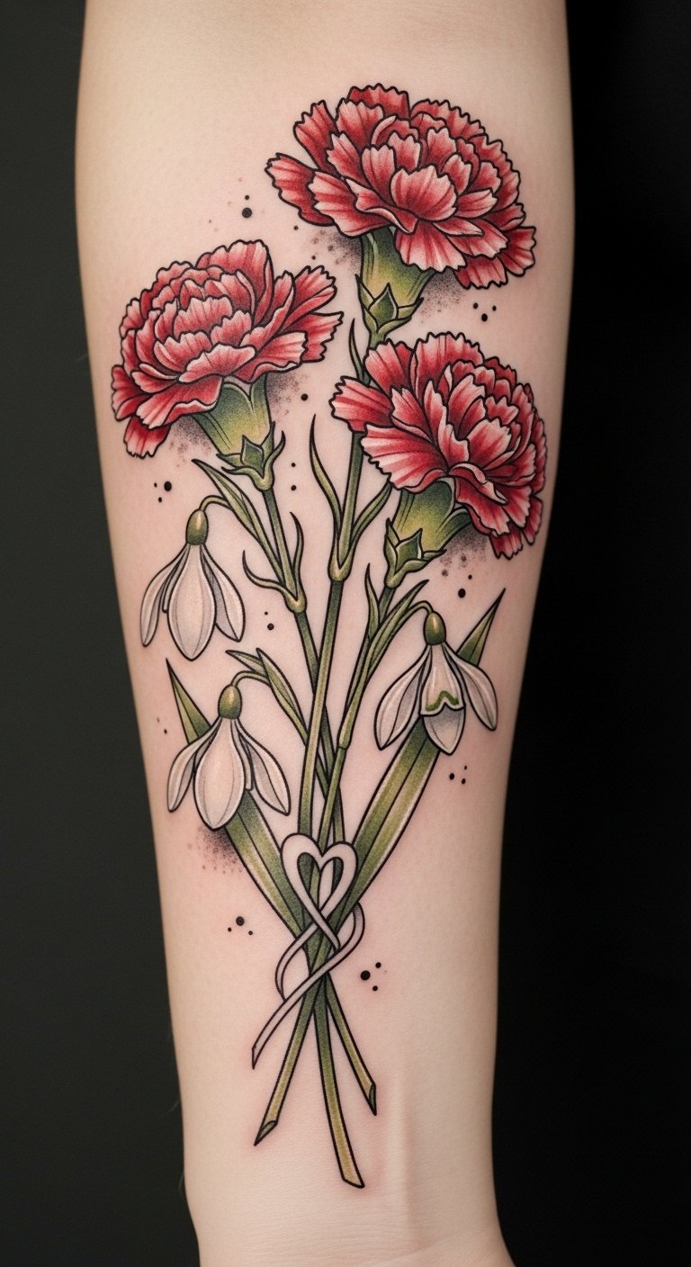 Carnation tattoos serve as a heartfelt tribute to cherished ones, encapsulating love and remembrance in their vibrant blooms.