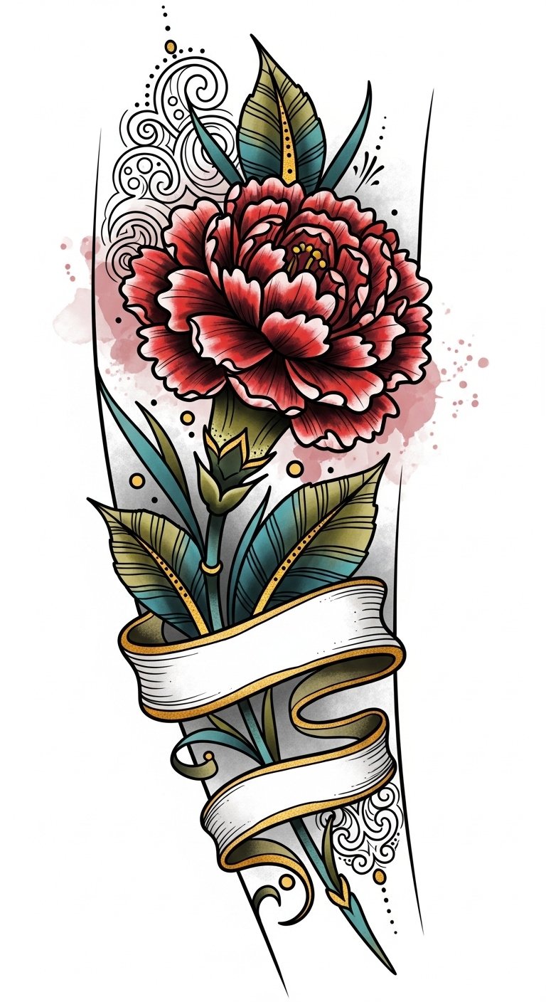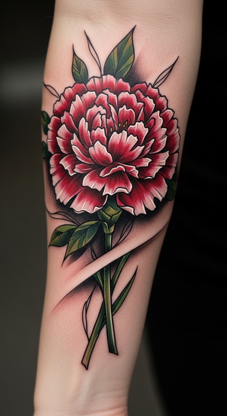 The design symbolizes a balance of strength and grace—the carnation’s layered petals representing resilience and the banner offering personal meaning. Emotionally it conveys confidence and nostalgia; placement on the forearm or upper arm emphasizes visibility and movement, making it a statement piece that flows naturally with the body.