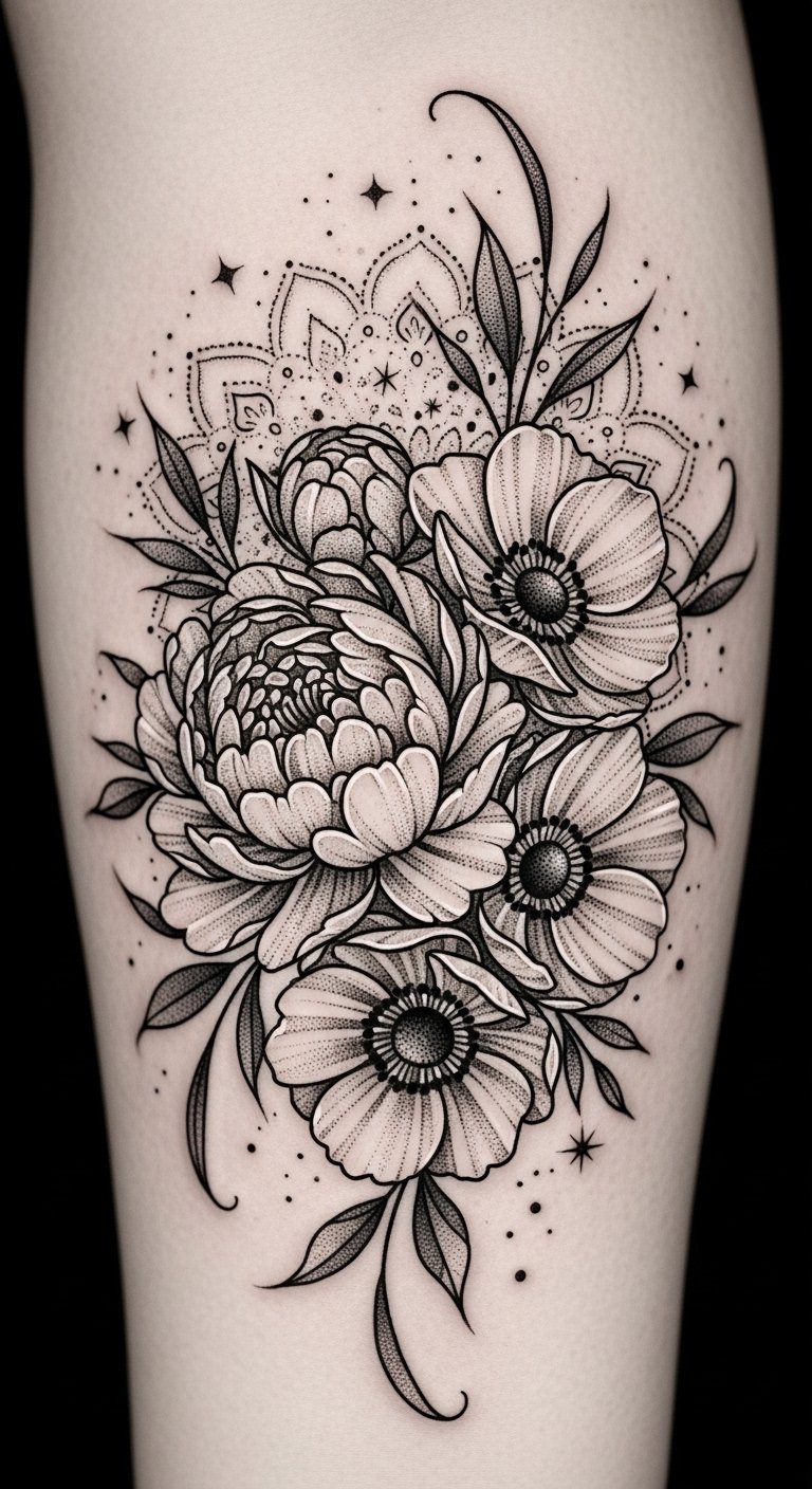 This design uses peonies and anemones to symbolize prosperity, resilience, and protection; the mandala lace adds harmony and inner balance, while scattered stars hint at hope and personal aspiration. Emotionally it reads as quiet strength and contemplative beauty.